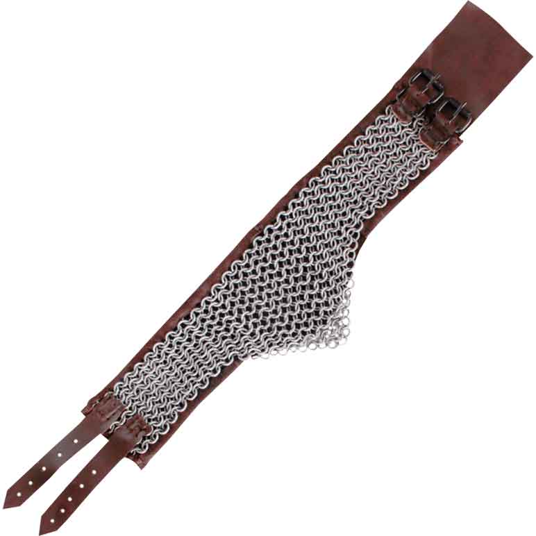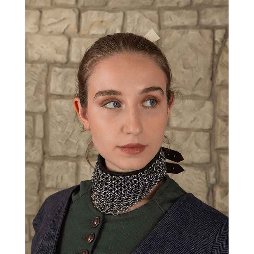 Keep the holy relic from wicked hands. The devout crusader remembers well the final request of the priest. The Richard Chainmail Mantle protectively adorns the medieval pilgrim, who follows a sacred path to a forgotten tomb. Mild steel rings fortify a brown suede leather collar, making this a perfect piece for LARP activities. The butted round rings link together in a traditional 4-in-1 chainmail pattern. A 4-in-1 pattern consists of four chainmail rings woven through another ring. This medieval mantle matches with the rest of the Richard chainmail armour set. Complete your knight crusader costume with this fine chainmail collar adorning your neck.