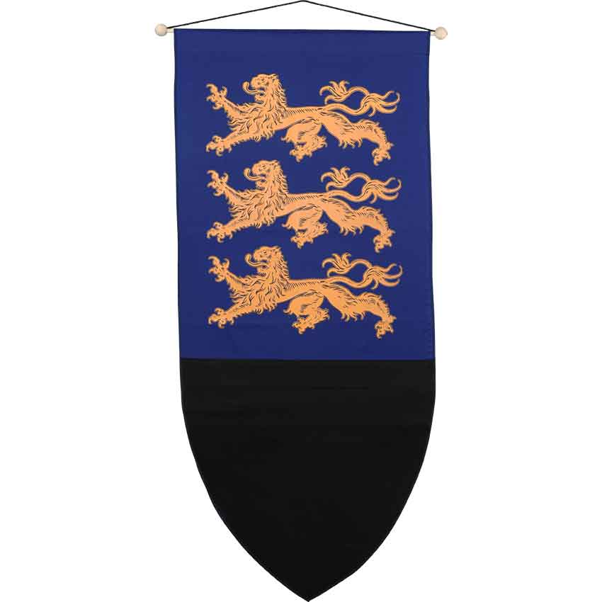 You leave your tent to talk to your commander. The Gold Richard The Lionheart Heraldic Banner hanging nearby reveals your allegiance to the king. The medieval banner comes in a range of color options. These color options wonderfully complement the high-quality direct to garment printed design. That design features the triple lion pattern typical of Richards royal coat of arms. These golden lions have intricate detailing giving it a more lifelike appearance. In addition, this medieval style banner has a heater shield shape, so it is straight along the sides and then curves into a point at the bottom.