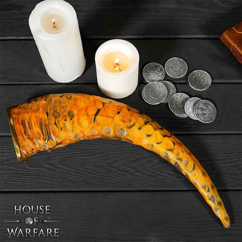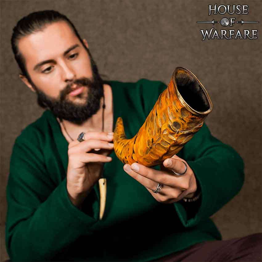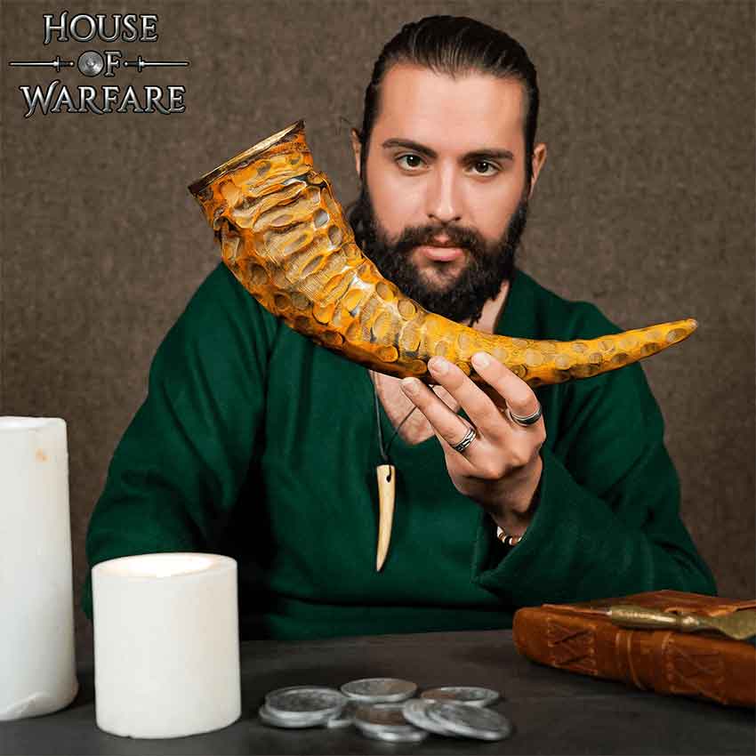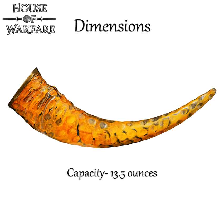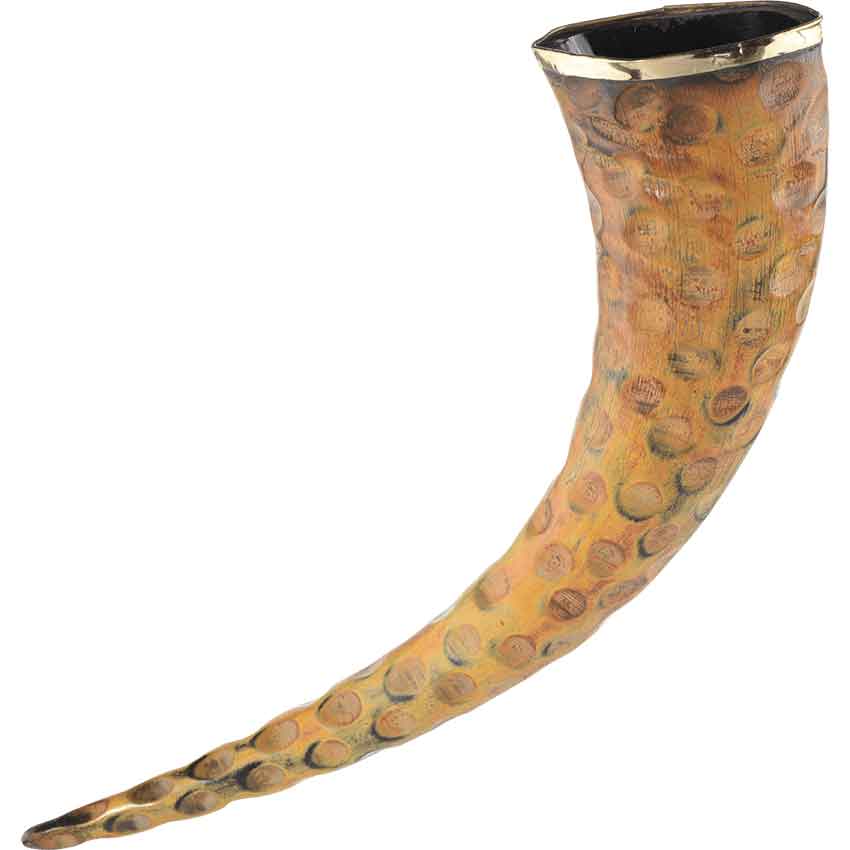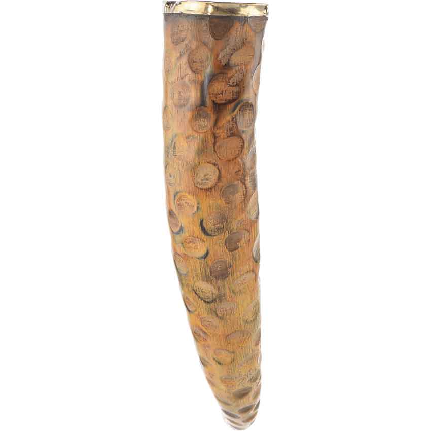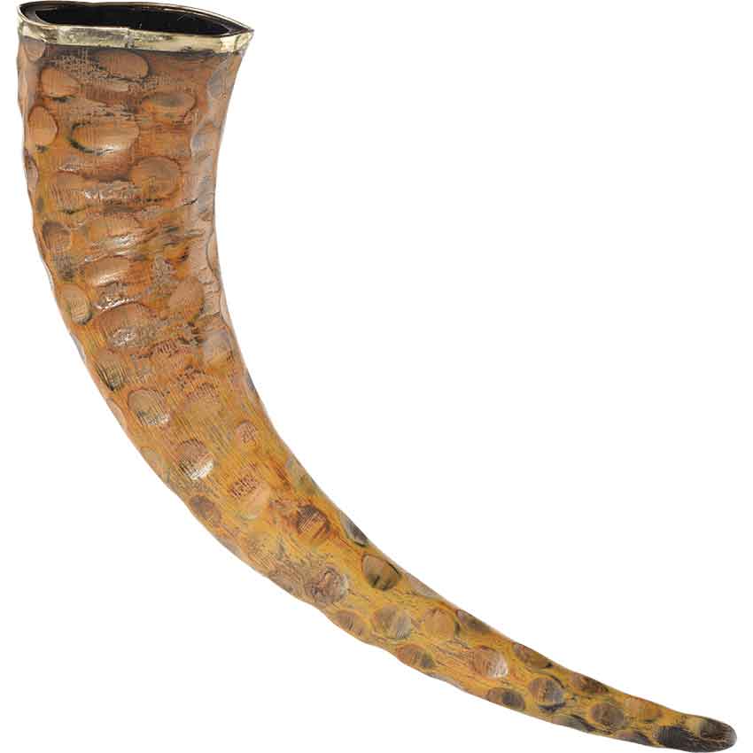 You and your group have just completed a hunt. You celebrate your victory with a toast to the gods and then you drink from the Rippled Drinking Horn. Made of natural horn, this drink-safe horn features multiple small divots. These divots give the horn its distinctive rippled look. A small brass ring adorns the horns rim. The Rippled Drinking Horn looks great as part of a historical reenactment, LARP event, or cosplay. You can also use it to decorate your home or office.