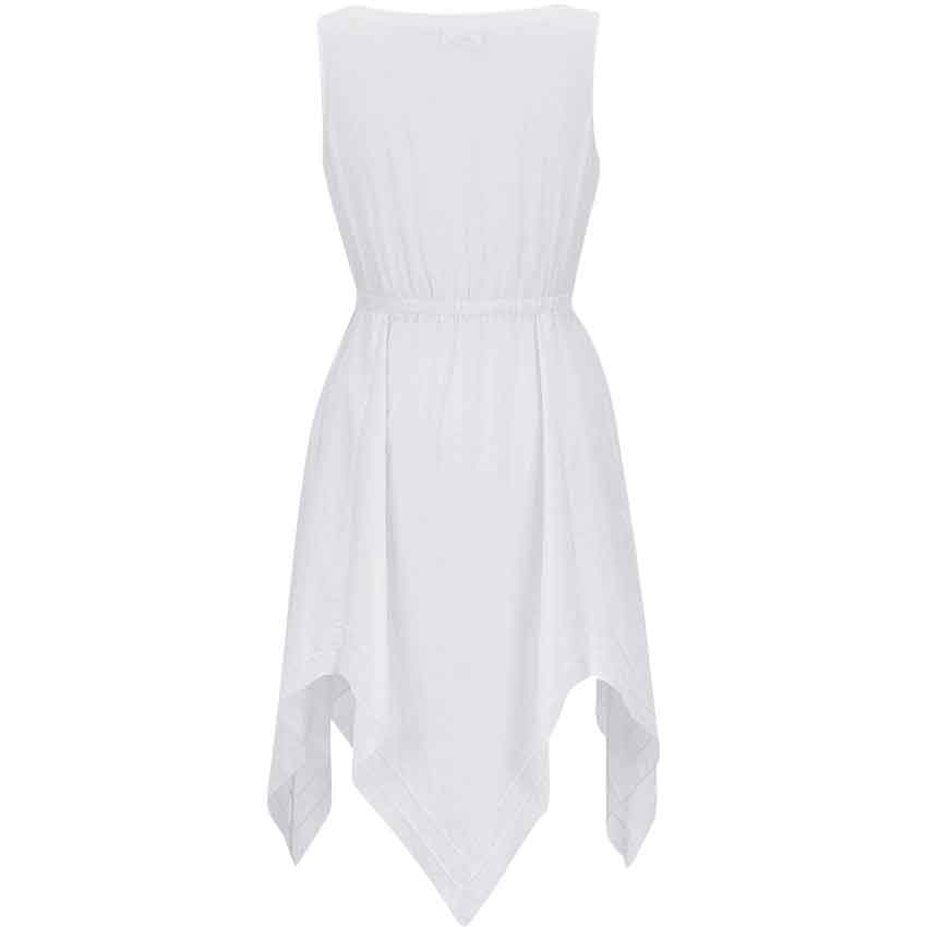 The handkerchief skirt adds a unique and visually intriguing dimension to the ensemble. Designed with strategic slits, it allows for glimpses of the included white chemise layered beneath. This peek-a-boo effect adds a level of sophistication and depth to the overall look. The chemise itself follows the same handkerchief hemline shape, mirroring the design of the skirt and creating a cohesive, well-rounded aesthetic.