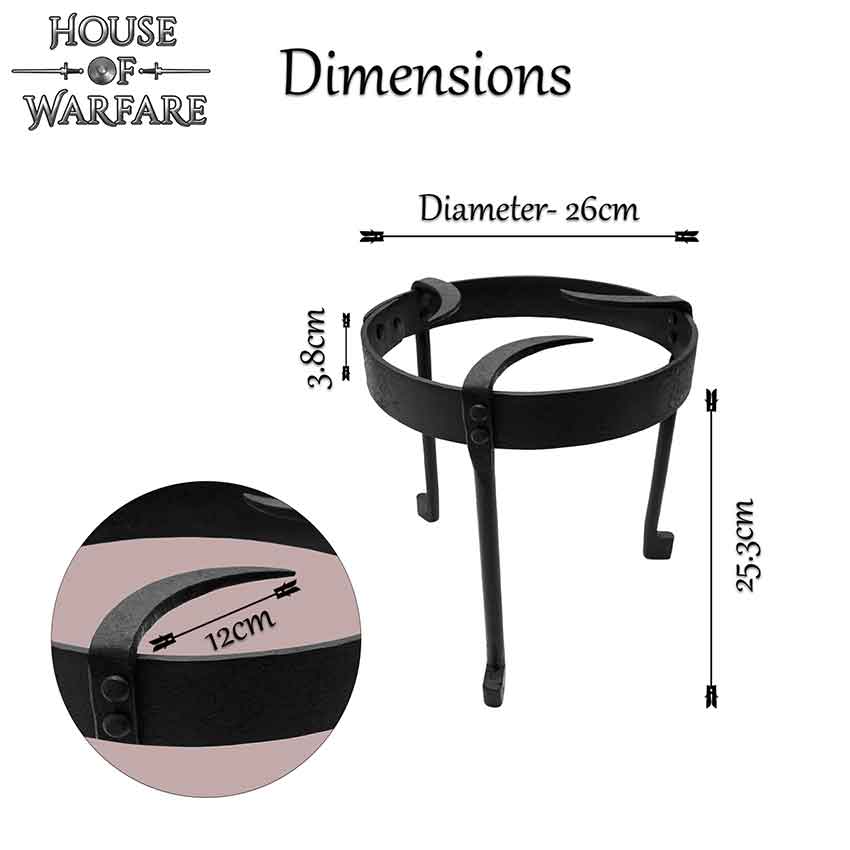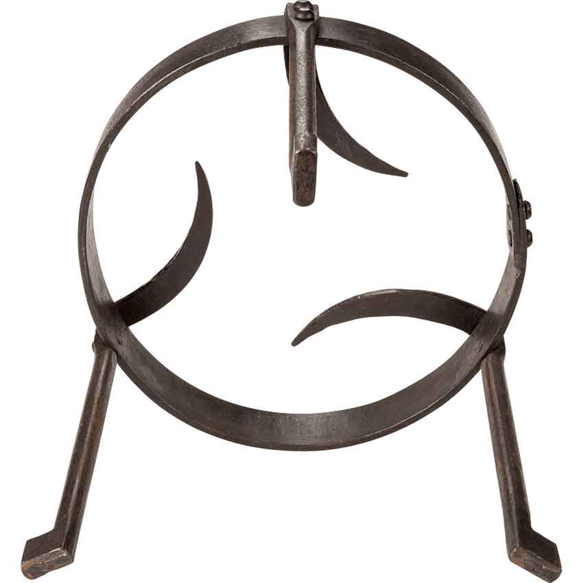 Make your historical meals more interesting using the Round Steel Medieval Cooking Stand. This iron cooking tripod is handcrafted and based on historical styles. The top platform is a circle outline with curved supports for keeping pots and pans held up above a fire. These curved supports are secure to the circle outline and then extend down to form the three thin legs. Whether you are embarking on a medieval camping trip or setting up a historical reenactment event, this hand forged cooking stand is perfect for placing over a fire and preparing your meal in an authentic way.
