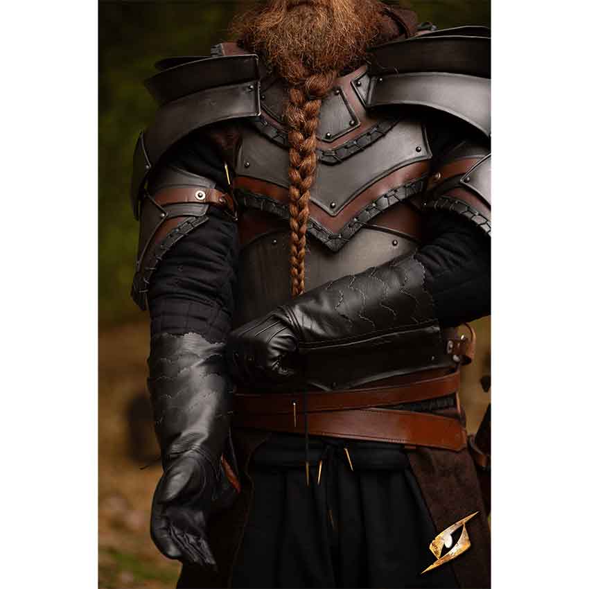 Made from leather, these fantasy gloves are an excellent accessory for your LARP character or costume. They’re sold as a pair. In the front, they have embossed lines over the knuckles and leading into the fingers for added layers of style. These gloves cover the entire hand and most of the forearm. Along the top of the forearm, they have layered scale patterns. These gloves come in two color options, black and brown. With multiple sizes available, you can choose the one that fits best.