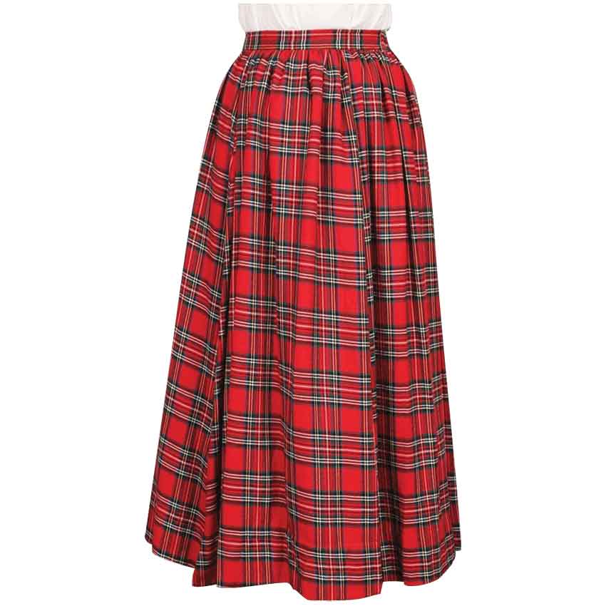 The Highlands come alive when you wear this full cut, floor length Scottish Plaid Skirt. Made of a soft, cotton blend plaid, this tartan skirt offers a flat front waistband with an elastic back for a sure fit for any Scottish event. After the defeat of the Jacobites at Culloden in 1746, the British government passed an Act of Proscription which banned, among other things, the wearing of tartan. The Act was repealed in 1785, but it was not until 1822, when King George IV made a visit to Scotland and demanded that all citizens should wear their clan tartan, that the tartan industry was reborn. This Scottish Plaid Skirt will suit you well at any Highland Games or Renaissance fair, as well as adding a touch of bonny style to any modern outfit.