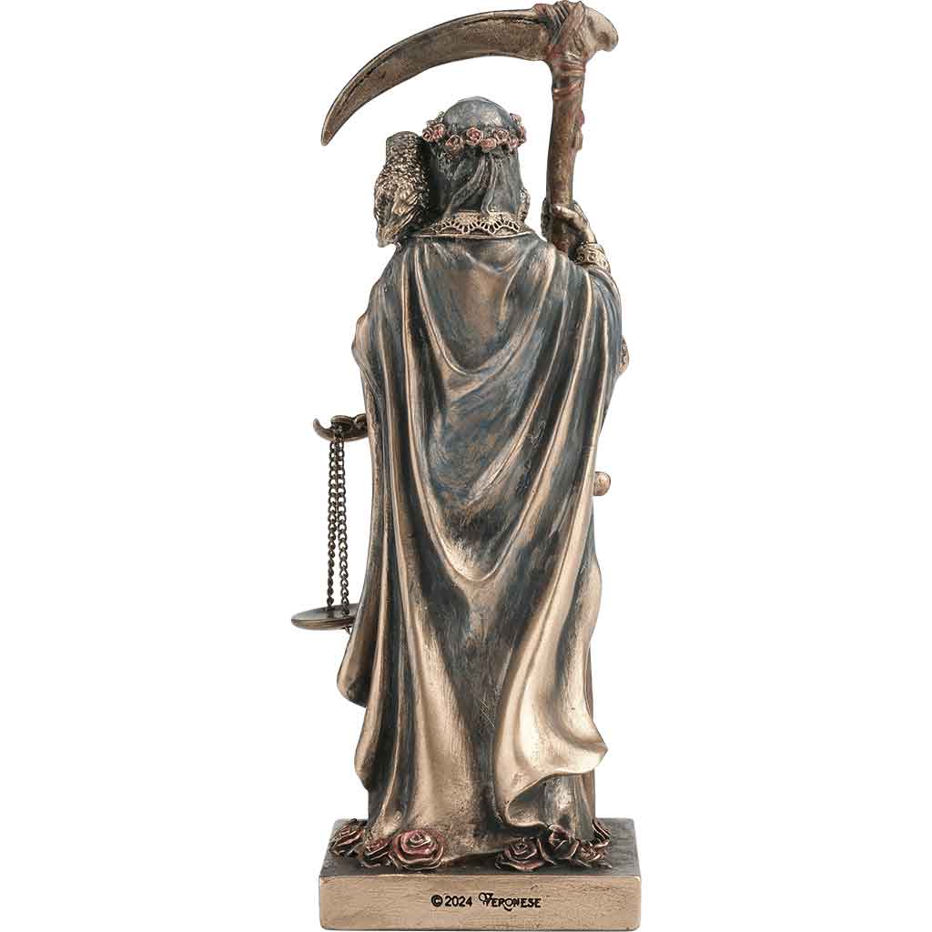 On her left shoulder, an owl is perched to represent wisdom. In her right hand, Santa Muerte holds a scythe adorned with roses. In her left, she holds the scales of life to represent impartial justice. A plaque in front of the statue reads “SANTA MUERTE.” This Santa Muerte statue is on a square base, making it easy for you to place it on most flat surfaces.