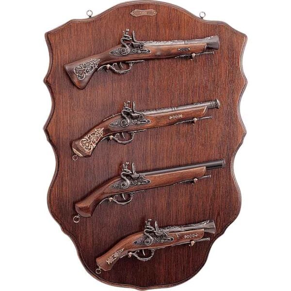 This gun set comes with a wooden display plaque. The plaque has a tall design with wavy sides. This plaque has four pairs of hooks to hold the guns. In addition, at the top, there is a metal label along with a pair of rings for hanging the plaque.