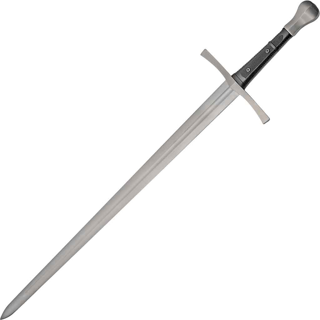The steel cruciform crossguard ends in angled quillons facing toward the blade. In the center, the angled chape extends slightly over the base of the blade. Intended for one to two handed use, this longsword has a black thermoplastic handle. The handle is textured with grooves and a checkered pattern to secure your grip. Moving down to the bottom, the peened, faceted scent-stopper pommel is made of steel.