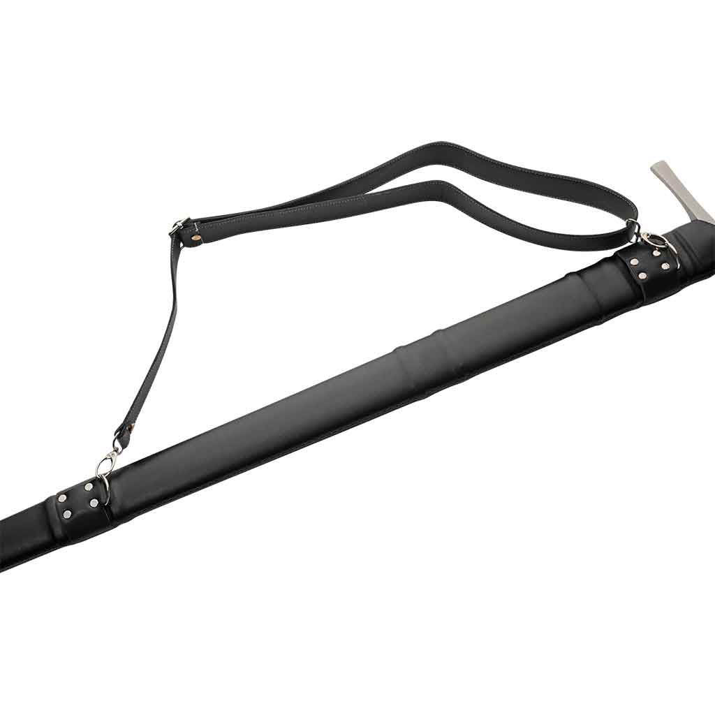 This one-handed knight sword comes with a black leather-wrapped scabbard. The throat is stitched with black leather for added detail and securing the guard when sheathed. The scabbard’s body has black leather bands with steel suspension rings. The steel chape at the bottom ensures the tip doesn’t poke through. You can wear the scabbard across your back thanks to black leather straps. These straps have lobster clasps that hook around the steel suspension rings. This buckled black strap can also be adjusted for the perfect fit.