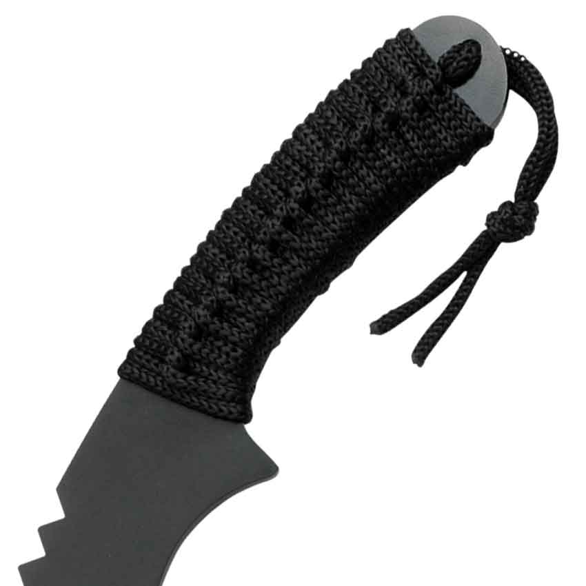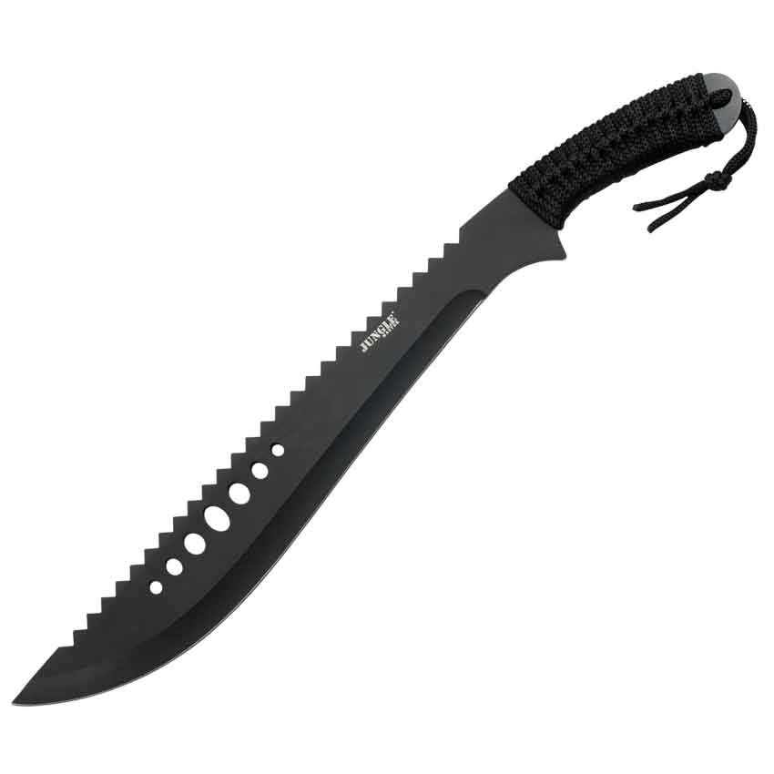 Short blades are not always a bad thing. Sometimes, a short blade is easier to maneuver, which can mean a lightning-fast reaction in the heat of the moment. And that is a very good thing, as well as one of the strengths of this Short Jungle Master Machete. This machete is, hands down, a great little tool to own, featuring a distinctive blade-shape that serves only to enhance every swing. The blade swells near the tip, giving it a more rounded edge with plenty of belly and plenty of weight, allowing this small-sized machete to move quick and hit hard. The spine of the blade runs straight, giving the machete a rounded point at the tip for the occasional thrust, while the jagged, angular serrations add a new level of function to the machetes back. The machete is made entirely from one piece of blackened stainless steel, and the grip is wrapped in black cord for a secure hold. It also features a slightly angular curve, which puts the blade ahead of the hand, allowing for a quicker, more potent swing. The machete comes complete with a matching black nylon sheath for easy and convenient storage. As its name implies, this Short Jungle Master Machete will handle jungles and foliage with ease, just as it will also serve as a self-defense weapon in a pinch, should you find yourself faced with wild beasts, threatening assailants, or even the rare zombie or two.