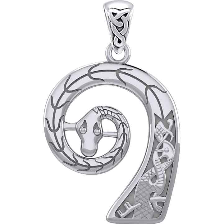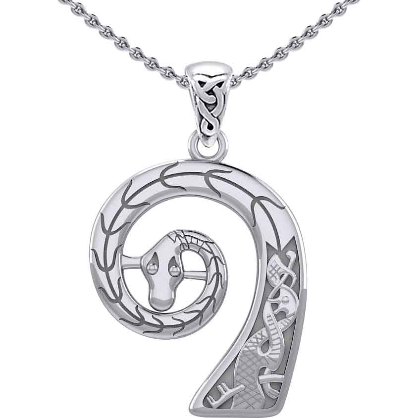 Do not forget to show off your Viking warrior pride while doing your daily errands. Wear the Silver Viking Ship Prow Pendant every day. Made from .925 sterling silver, this pendant depicts the prow of a ship. This spiraled prow takes the form of a snakes head. The snake faces the viewer. A carved spine detail runs along the snakes back. At the base of the prow, there is a unique knotwork pattern with a dark background. A bale connects to the top of the prow. It features a triquetra with an extra loop. This silver Viking pendant makes a lovely personal accessory, adding Norse style to any outfit.