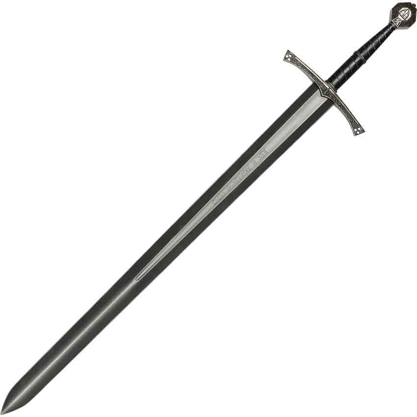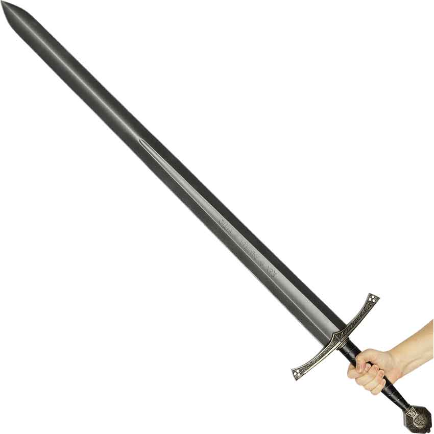 Next, the sword continues with a cruciform crossguard. The side of the crossguard closest to the blade has curved edges. In addition, each arm has three holes on the end. Ornate detailing adorns the entire crossguard. Then, the handle has a black grip. The black grip looks like it is wrapped leather. There is a ring in the center of the grip. Finally, the handle ends with an octagonal pommel. Unique accents adorn the brass-colored pommel. The Sir Radzigs LARP Sword looks great with a variety of characters at a LARP battle or cosplay convention.