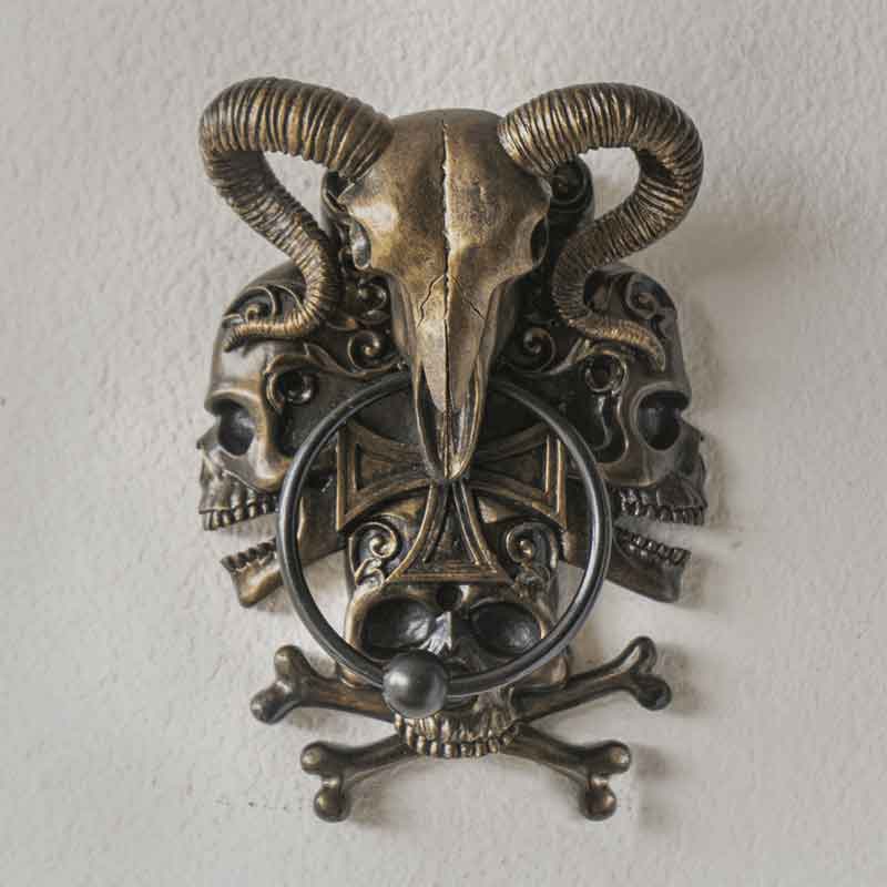 From gothic homes to pirate ships and more, the Skull and Ram Door Knocker greets any visitor to your abode with some distinctive style. It makes it truly easy to show off your taste before you even open the door! Made from cold-cast resin, this gothic door knocker has four bronze-colored skulls creating one macabre 3D look.