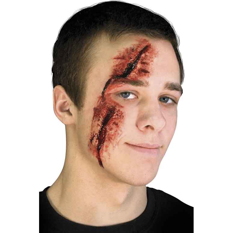 Wearing this wound will make it seem like you had a close encounter with something decidedly not friendly. This Slashed Eye Face Prosthetic depicts an awful looking gash that is designed to encircle and cross over the eye. This impressive looking injury is made entirely out of high quality latex that has been hand painted in fleshy, gory tones to simulate as much realism as possible. The wound consists of two pieces that, when combined and worn on the face, create a sinister gash that circles around the eye and runs the entire length of the face. Of course, this wound can also be broken up and used on the hands, arms, chest, legs, or anywhere else on the body. This latex appliance was also made to be easy to apply, requiring only a bit of spirit gum to adhere the piece to the skin. Please note, however, that this latex wound does not include spirit gum or fake blood, although both additions can be purchased separately on this site. Were you attacked by a lunatic or murderer? Did you have a close call with a zombie? Was a werewolf looking to make you its next meal? Any of these are plausible causes to this Slashed Eye Face Prosthetic, making this false wound a great addition to virtually any costume you can think up, so long as it needs a gruesome and grisly wound.