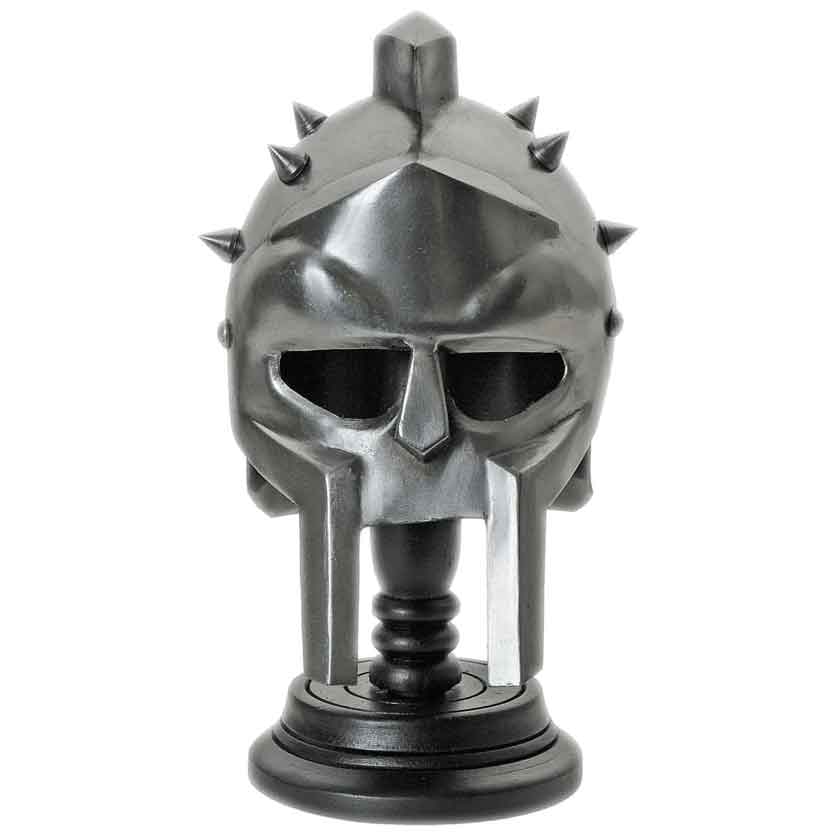 Meanwhile, above the face guard, there is a crest that runs down the top of the head. On each side of the head, there are multiple spikes. Each conical spike is short. The inside of the helmet has a black finish. Finally, this helmet comes with a black wooden display stand. This miniature helmet is great for adding some historical style to any home or office space. Also, the Small Gladiator Helmet with Stand looks perfect in a Roman-themed collection.