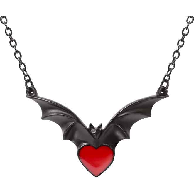Looking for a piece of romantic gothic jewelry to wear with your favorite outfit or ensemble? Check out the Sombre Desire Necklace. Made from blackened pewter, this necklace comes on a silver-colored chain. It fastens with a lobster clasp. The gothic necklace depicts a black bat in flight with its wings spread out to the sides. The tips of the bats wings attach to the chain. Below the bat is a red enamel heart. The Sombre Desire Necklace makes a wonderful personal accessory or an addition to a gothic jewelry collection.