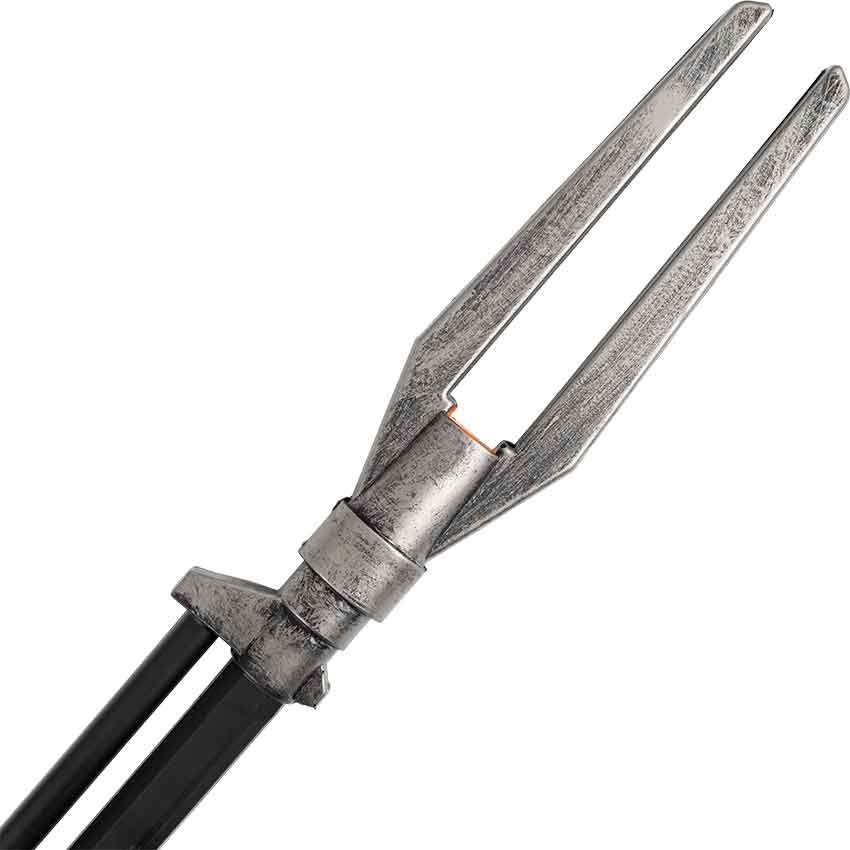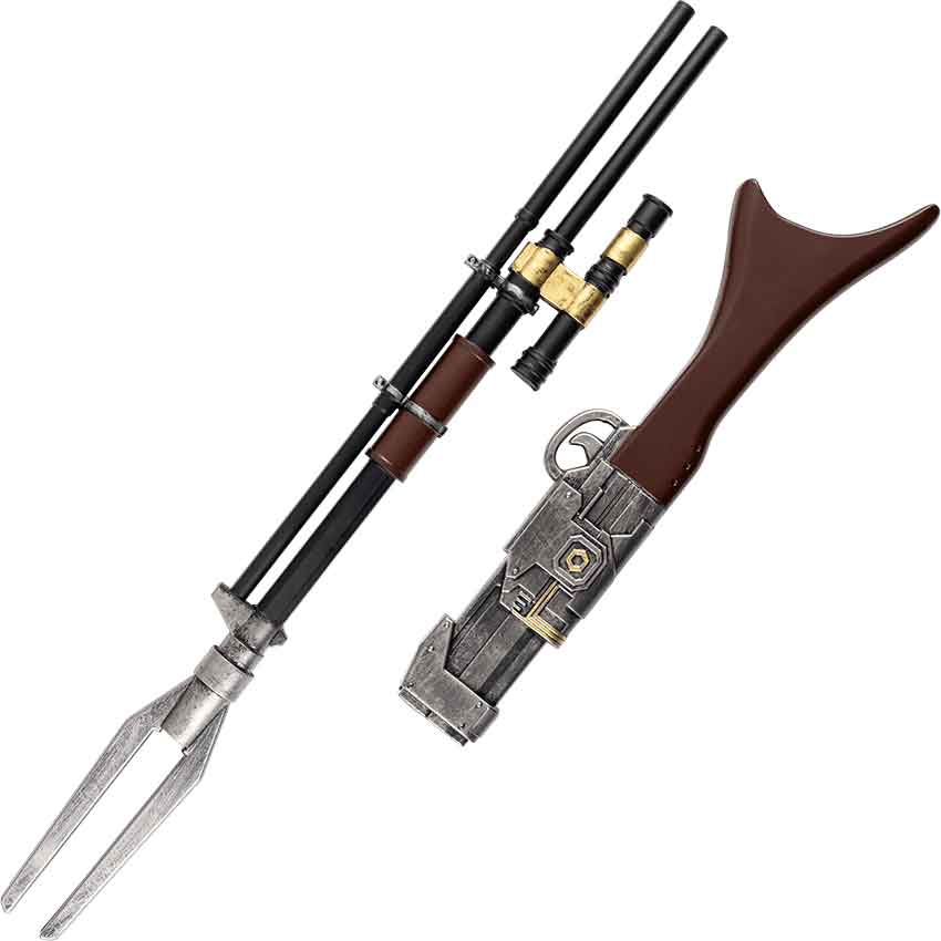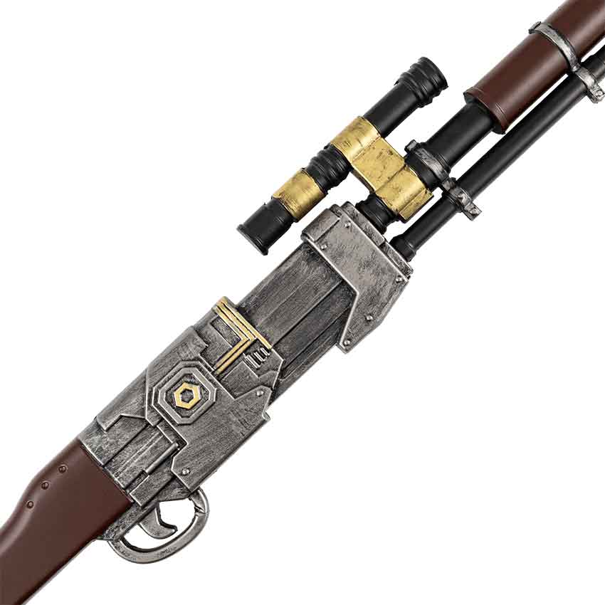Made entirely from foam, this sci-fi blaster rifle is inspired by the Amban phase-pulse blaster from the Star Wars universe. This foam rifle is an excellent cosplay prop, and is not capable of firing real ammunition of any kind. This disintegrator rifle has a rustic aesthetic with a sci-fi design. The long stock is brown and looks like real rifle stocks. Silvery gun parts like the chamber and the trigger are accented with gold. Upon closer inspection, the chamber has a golden hex and pipework. The black scope has gold-painted metalwork on it. Down the barrel, a broad brown cover adds depth and realistic detail to the weapon. The long black barrel ends in a silvery fork-shaped resonator.