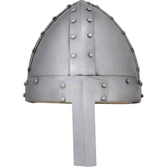 As you set forth to raid an unsuspecting nearby village, you place the Spangenhelm with Straight Nasal Guard onto your head to protect it in battle. Made from 16 gauge steel, this Viking helmet comes in two sizes. It secures to the head with a chin strap. It also has a full leather liner. Next, the helmet has a rectangular piece on the front that guards the front of the nose. Rivets secure the nasal guard to the rest of the helmet. Steel strips cross the top of the cap. Rivets also secure these strips into place as well. Wear this Norse helmet to your next historical reenactment or Renaissance faire.