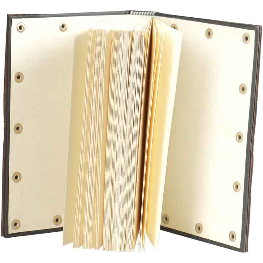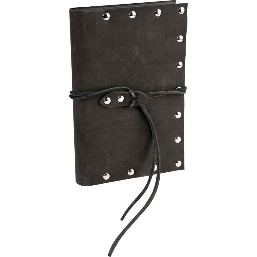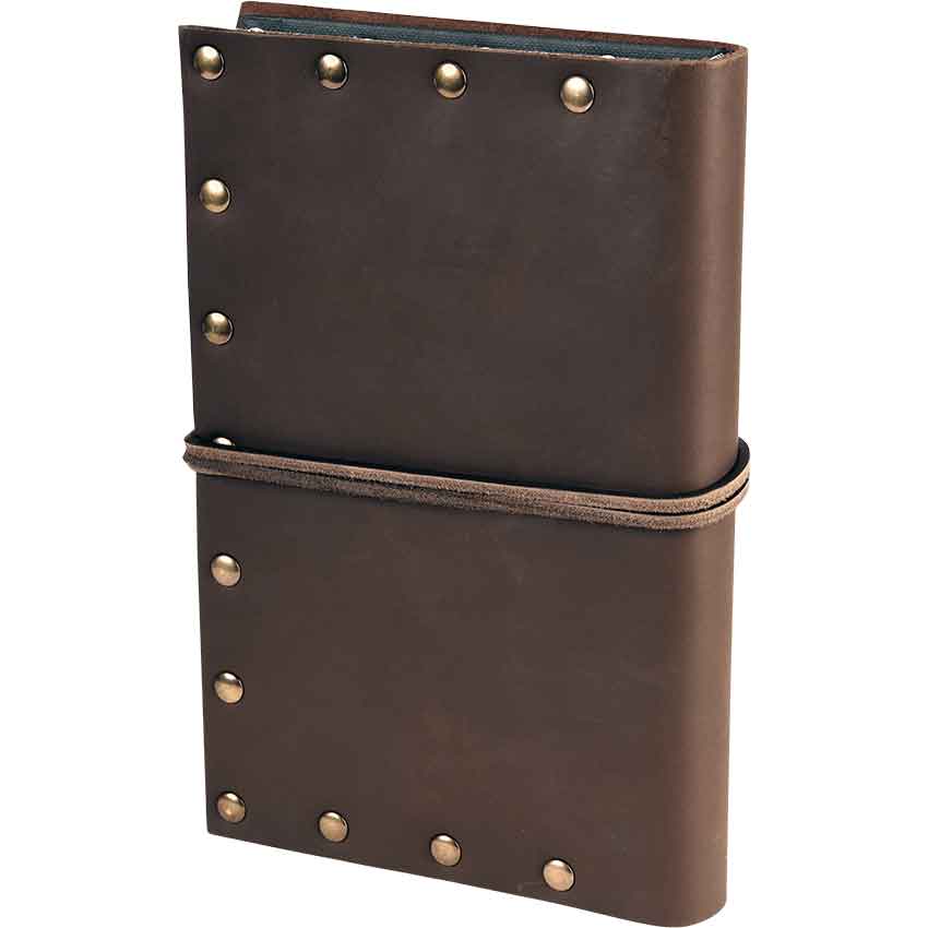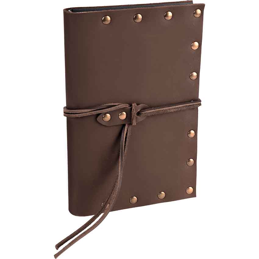 Alchemist, wizard, or bard, you will find that you need to record your thoughts often. You should use the Spellbook Leather Journal. Made from 5-6-ounce vegetable-tanned leather, this notebook comes in two colors and sizes. Each notebook fastens closed with a leather tie that wraps around the book. A leather strip attached to the tie secures it to the front cover. Rivets attach the strip to the cover. In addition, rivets adorn the top, bottom, and outside edges of the covers. The number of rivets changes with the size of the book. For example, the small size has three rivets along the top while the large size has five rivets. On the inside, there are 100 sheets of ivory-colored paper. The Spellbook Leather Journal is great for a variety of tasks, from writing to drawing and more.