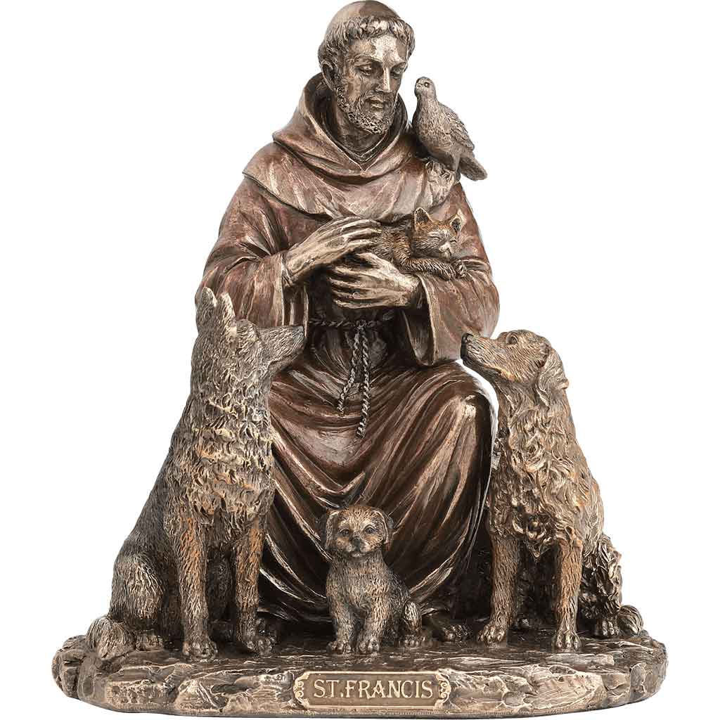 Crafted from cold-cast bronze, this Catholic saint statue is inspired by Saint Francis of Assisi, founder of the Franciscan order and a saint who has a profound connection to nature. Every detail on this saint statue is painted by hand. Saint Francis is depicted like his historical inspiration with a monk’s hairstyle and a hooded robe secured with a rope around his waist.
