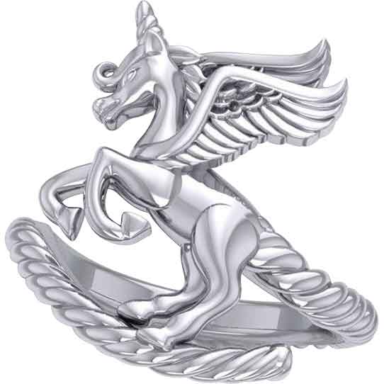 When you want to add the magic of a unicorn to your ensemble or wardrobe, make sure to check out the Sterling Silver Mythical Unicorn Ring. Made from sterling silver, this ring comes in a wide range of sizes, allowing both men and women to wear this wonderful piece. In the front, the ring displays a winged unicorn rearing back. It has its wings spread out behind it as if in flight. The unicorn has its front hooves lifted into the air. The unicorns tail forms the band of the ring. Its back hooves rest on the end of the ring band. This sterling silver ring makes a great addition to any jewelry collection or gift to a fan of fantasy.