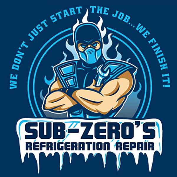 Employing a Mortal Kombat motif, the Sub Zero Refrigeration Womens T-Shirt features a hilarious design which sparks feelings of nostalgia for those who have grown to appreciate the unique fantasy based fighting games of this franchise. This funny gaming t-shirt features an image of Sub-Zero at the center of this design wearing his traditional gear, holding a wrench in his crossed arms. To emphasize his freezing powers, the image is largely depicted in blue and is set on a blue cotton shirt. Behind him is a background of flickering blue flames and below him is the name of his repair company. The slogan of his company is printed in a semicircle above him, referencing the signature catchphrase, Finish Him!, which is used throughout this gaming franchise. Express your love of Mortal Kombat and its historic role in gaming by wearing the Sub Zero Refrigeration Womens T-Shirt.