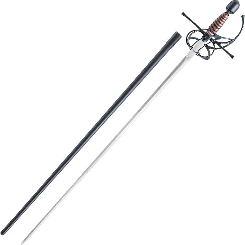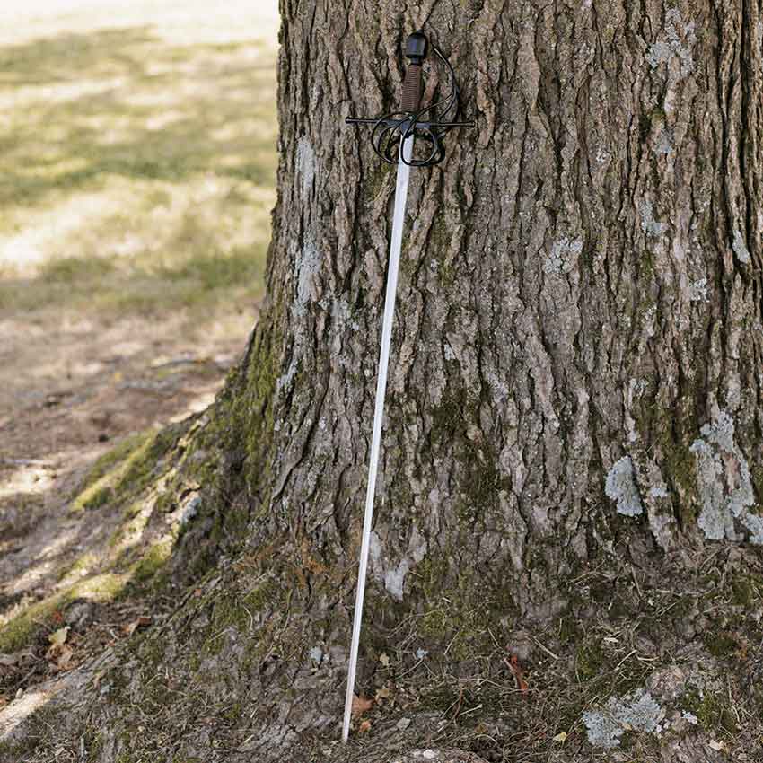 Presenting the Swept Hilt Rapier with Black Handle—a perfect blend of elegance and functionality. This rapier is more than just a sword; it’s a statement piece for those who appreciate the art of fencing and historical weaponry. It recalls those rapiers of centuries past.