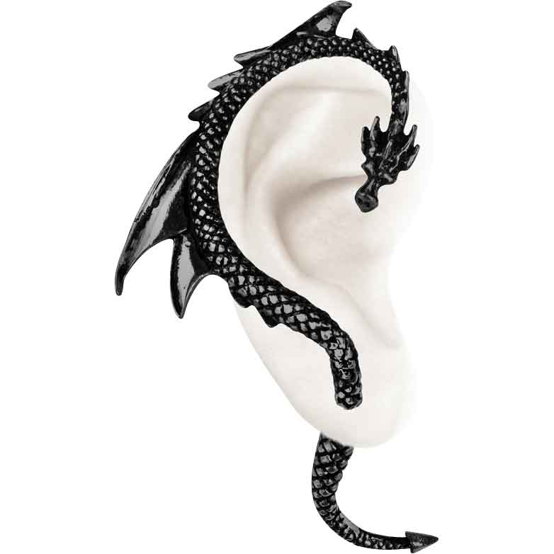 Some have an angel to sit on their shoulder, while others have a devil. You can have your own beast too, by putting on The Black Dragon’s Lure Stud. It will place a sibilant serpent over your shoulder that will whisper into your ear. This attractive earring accent is crafted entirely in fine English pewter, and given a darker tone to reflect a black dragons sinister appeal. The accessory has a surgical steel post that secures the dragon in place while its serpentine body twists up and around your ear. It is designed to fit the right ear. For a taste of fantasy in your everyday life, nothing beats having The Black Dragon’s Lure Stud secured over your ear.