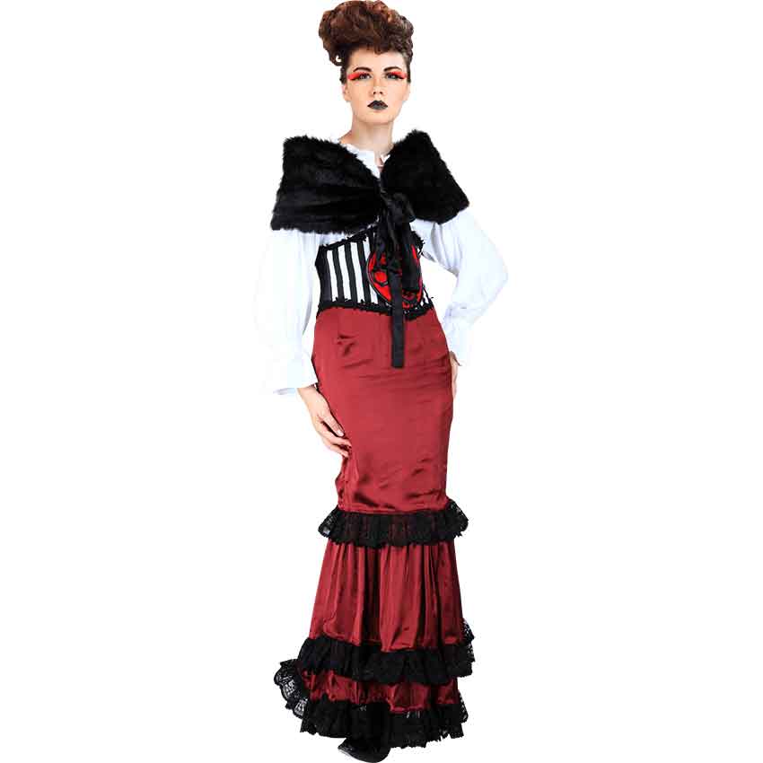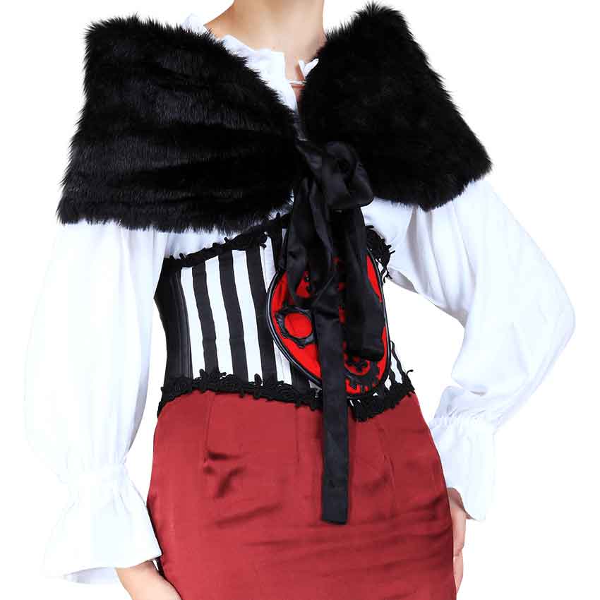 Wearing this shrug, you can wrap yourself in an envelope of warmth, grace, and confidence. The Walsingham Shrug is the perfect accessory for a lady of note and importance to wear when demonstrating her own impressive level of taste and style. This elegant black shrug covers the shoulders and upper torso when worn and consists of attractive faux fur, set with a black satin lining on the interior for comfort. This shrug is only available in one color, which is black faux fur. Wrap the Walsingham Shrug around your shoulders whenever you wear a nice blouse and a Victorian corset and you will create an elegant and brilliant look that will leave onlookers speechless time and time again.