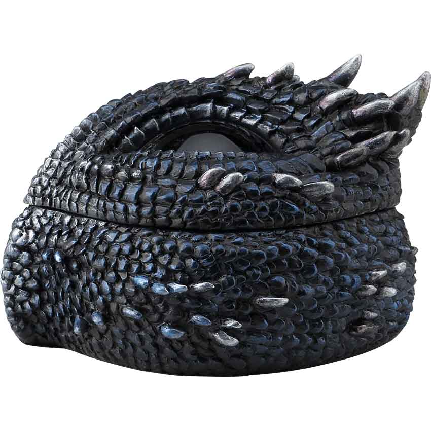 The Thorny Dragons Eye Trinket Box will make sure to keep a sharp eye on the precious treasures and trinkets that you store in it. Made from polystone, this hand-painted trinket box has a completely removable lid. The lid looks like a dragons eye. In the center is the blue slitted iris of the eye. Surrounding the eye is a series of blue scales with some silver-colored thorny sections at the outer edge. The sides of the blue box are similar, while the inside of the box is smooth. This trinket box is a fantastic piece of functional home decor and is a must-have for lovers of dragons.