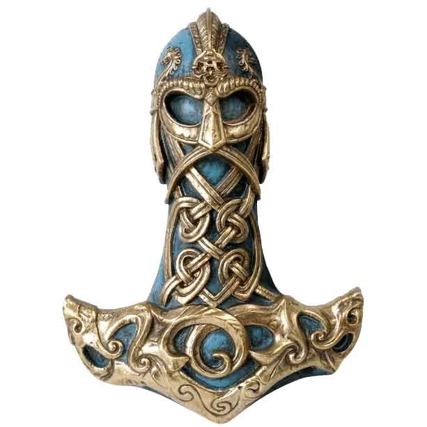 - Displays a teal Mjolnir hammer decorated in golden ornaments