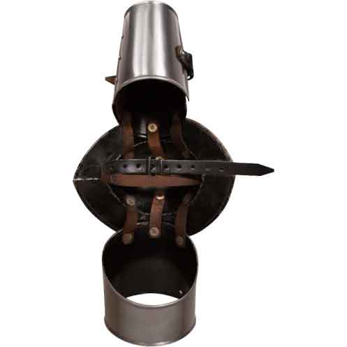 This medieval arm armour, sold as a pair, is designed as three distinct parts connected together. Forged from 18 gauge mild steel, this Mytholon armour piece is capable of standing up to intense LARP combat. This armour is also coated in oil to protect from rust. At the top, the upper rerebrace, also known as the upper cannon that guards the bicep, is a solid band and angled so you can slip your arm through and your movement will be unhindered. There are two eyelets at the top of this rerebrace, perfect for tying to your gambeson, mail shirt, and your shoulder armour alike. Below the rerebrace is the round elbow piece, also known as the couter, with rolled edges and rivets bolstering it. The rolled edges assist in deflecting enemy attacks.