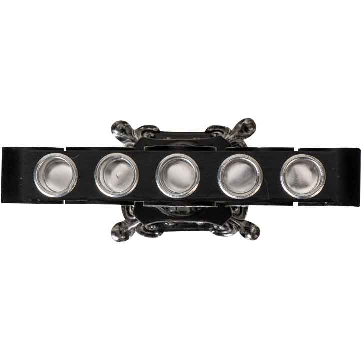 Underneath, the triple moon rests on an acorn-shaped neck. The neck is carved with intricate grooves for added detail. Below the acorn-shaped neck, a square base with silver studs and concave sides adds style. The bottom of the base has silvery baroque filigree curling in on itself at four ends. This provides a secure base that allows you to place this triple moon candle holder on most flat surfaces.