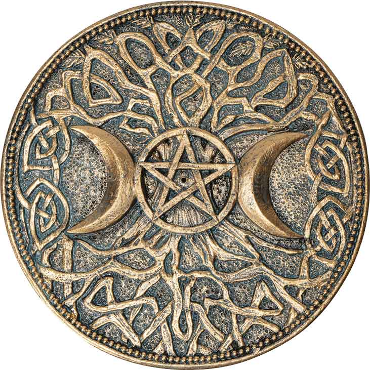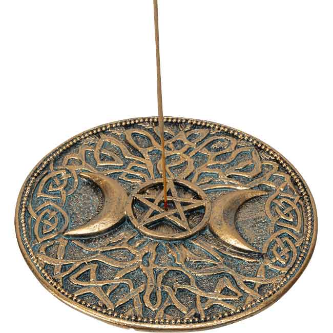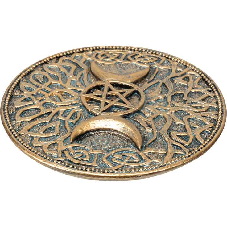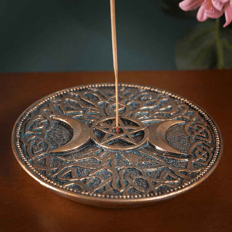 You can easily create a witchy atmosphere with your favorite scent and the Triple Moon Incense Burner no matter the time of year. Made from cold-cast resin, this hand-painted Wiccan incense holder has a circular shape with short sides. To begin with, the bronze, disk-shaped burner has a spot in the center for holding a stick of incense, not included.