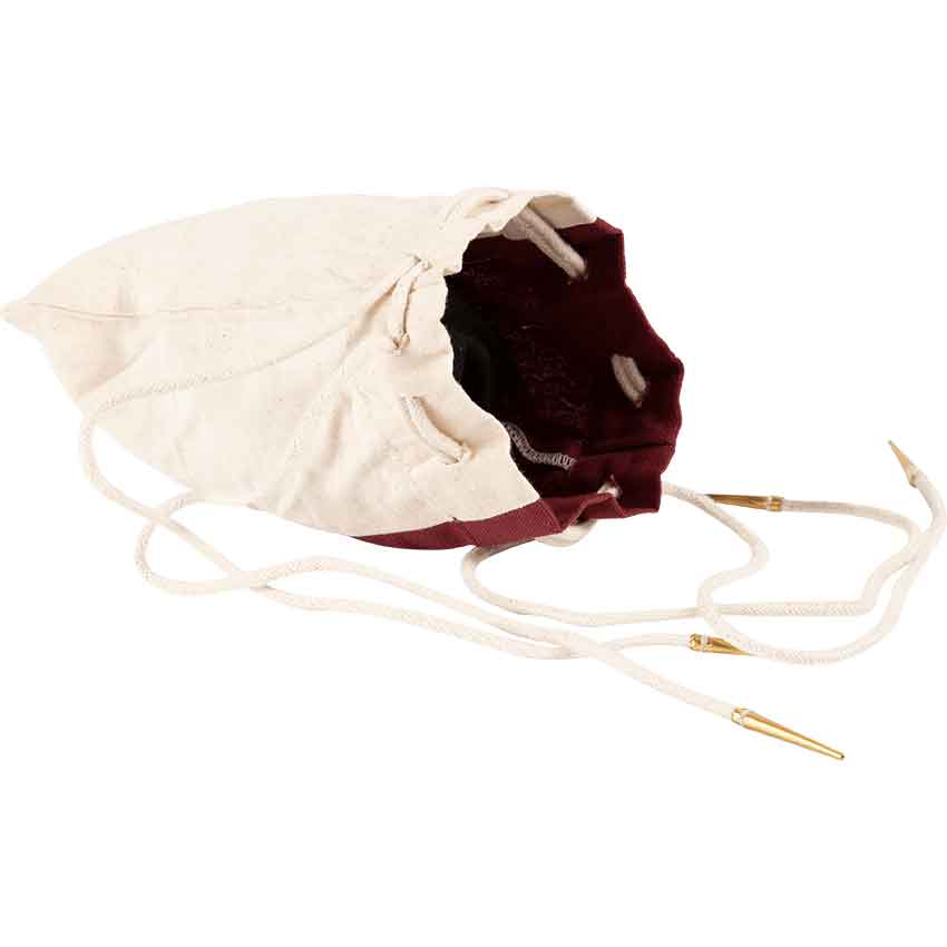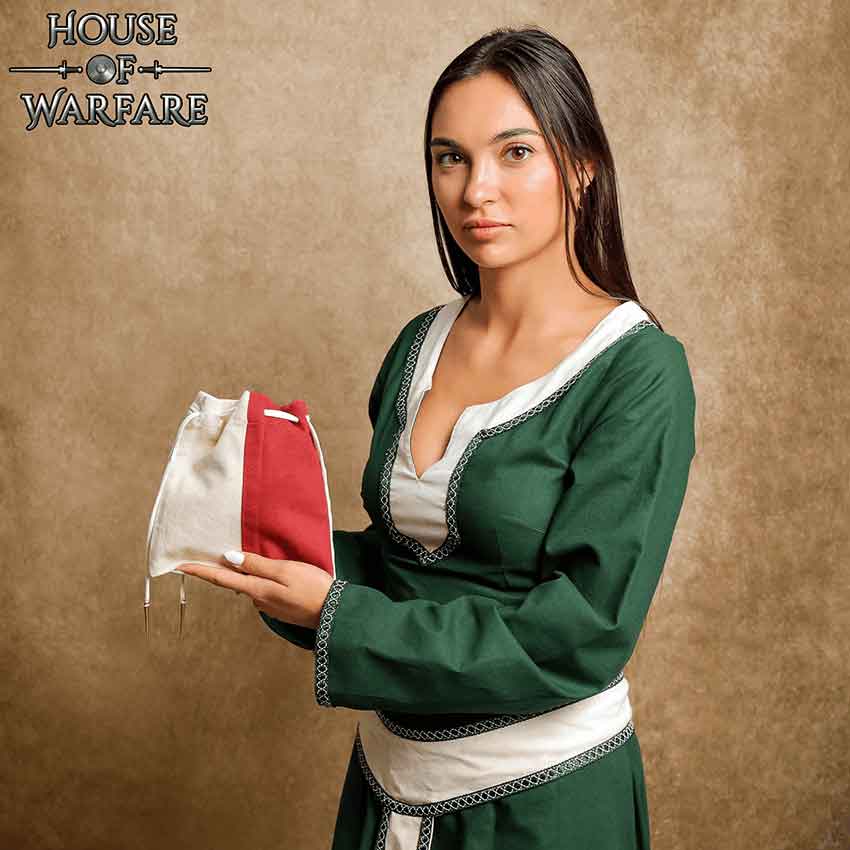 Sometimes your medieval costume has a two-color design and you want your accessories to match. Add our Two Color Cotton Drawstring Pouch to an outfit. First, this rectangular, cotton bag comes in a range of color options. Each color option listed mentions two colors. The bag, in half vertically, will have one half in the first color. The other half will be the second color listed. Next, the bag closes with drawstring ties. The drawstrings match one of the two colors. Also, they has brass tips. Finally, this pouch has a very versatile appearance. Thus, this cotton pouch is great for historical reenactments, cosplay, and LARP events.