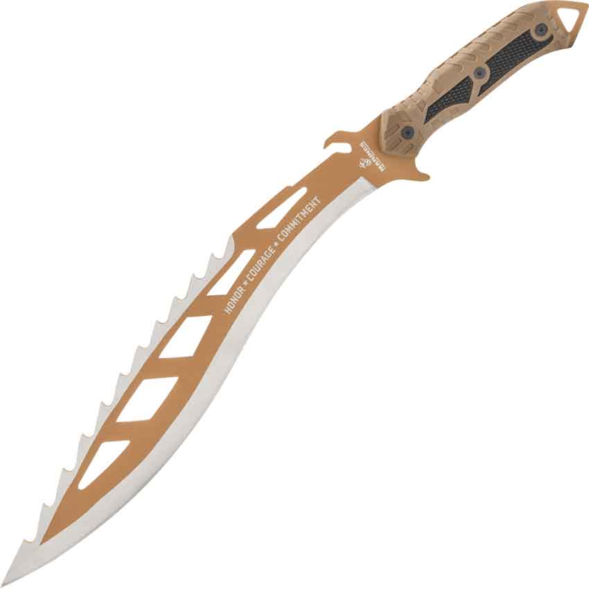 The words Honor Courage Commitment adorn the tan-colored blade near the base. It is in silver matching the edges and contrasting the rest of the blade. The base of the blade forms an angled crossguard to help keep a hand from sliding onto the blade.