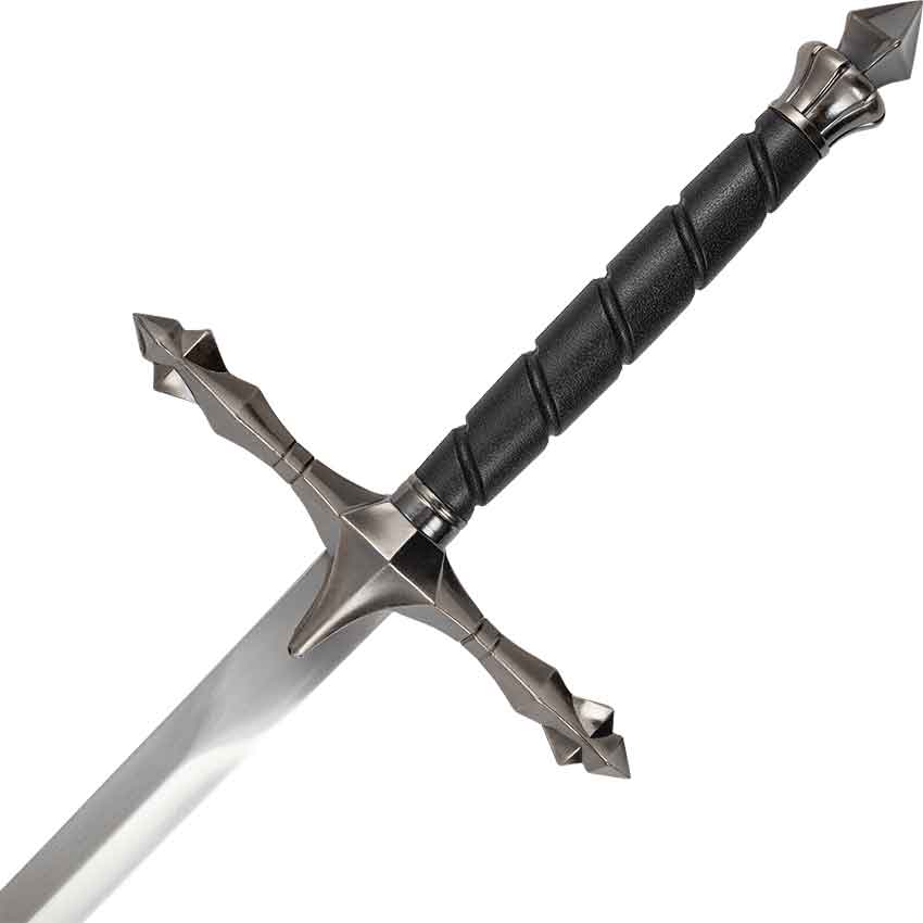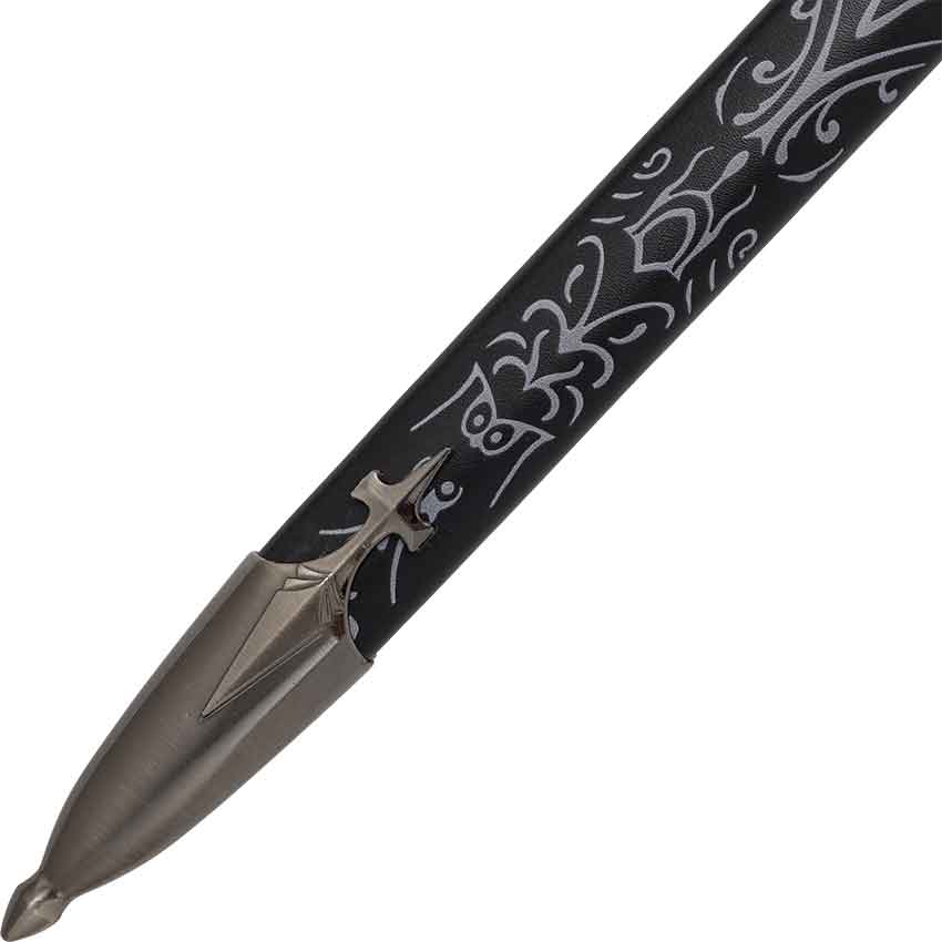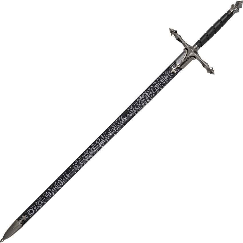 Inspired by the heirloom sword of Alucard, son of the legendary Dracula from the Castlevania series, this sword has a distinct dark fantasy design with excellent decorative appeal. Starting with the material, the blade is forged from stainless steel. Stainless steel is renowned for its durability and rust resistance. The silvery, fluted scent-stopper pommel has a rhombus-shaped spike at the end. The black plastic grip has spiraling grooves that add security and a tactile experience for your grip. The angular, twisted crossguard has two grooves near the center. The chappe has langets that extend over the shoulder of the blade. Moving down the length, the silvery dulled blade is long and thin. This dark fantasy vampire sword has a black patterned scabbard. The scabbard has intricate silver filigree and other vampiric iconography down the length. The scabbard also has silver fittings at the locket and the chape. The locket has an upside down cross as an extension.