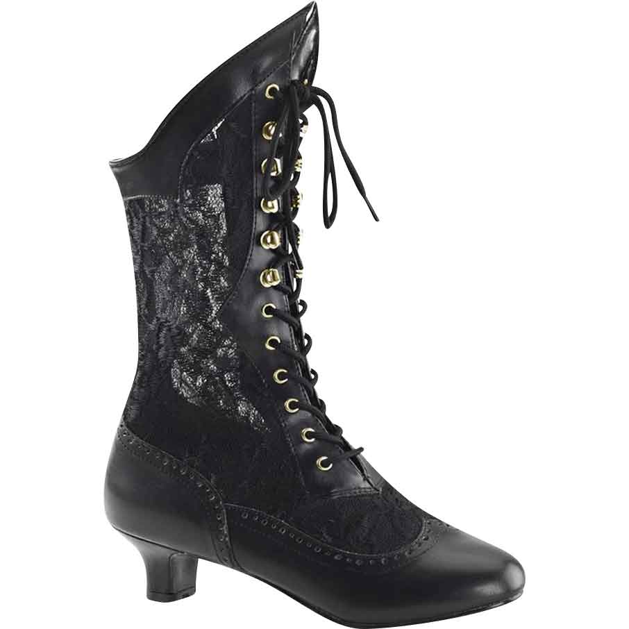 Show off your delightful period style even in your footwear with the addition of these kitten heel boots to your look! The Victorian Lace Ankle Boots rise low on the calf before dropping down into a low, 2-inch heel. The asymmetrical cuff of these kitten heel boots creates a classic silhouette. These faux leather boots can suit a number of different outfits, from Gothic to bridal. They lace up the front and display panels of rose lace over the sides for charming detail. A perforated broguing pattern decorates the wingtip toe and counter of these Steampunk boots. These ladies shoes do not have a zipper, allowing you to have a truly authentic period look. Perfect for Victorian, retro, and pioneer woman ensembles, you can make these shoes into part of a costume or everyday outfits!