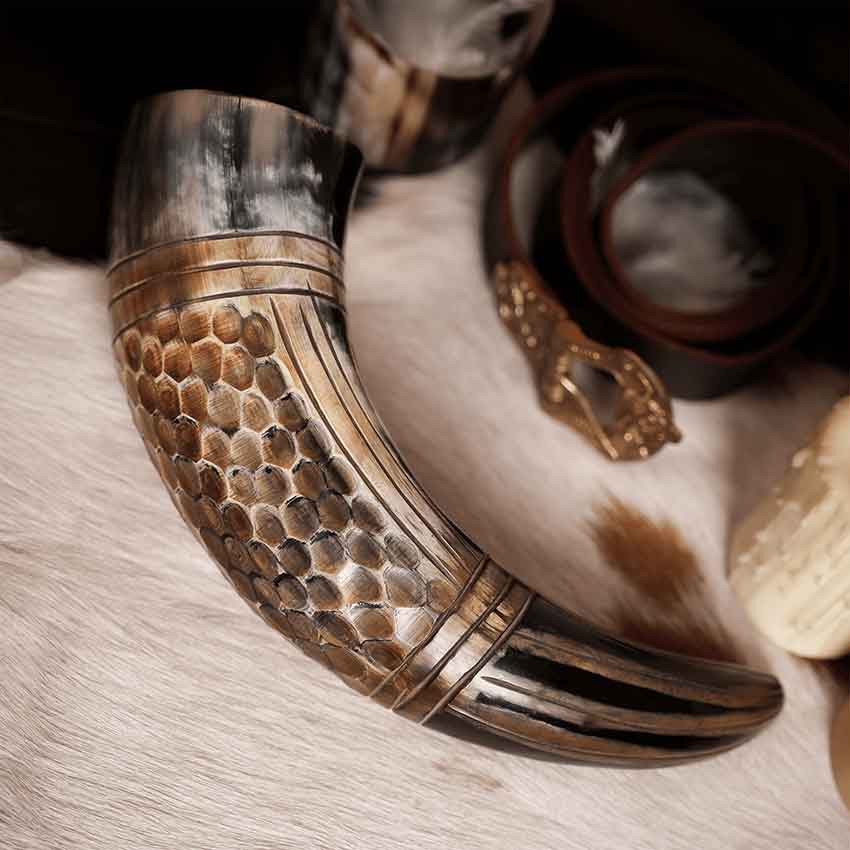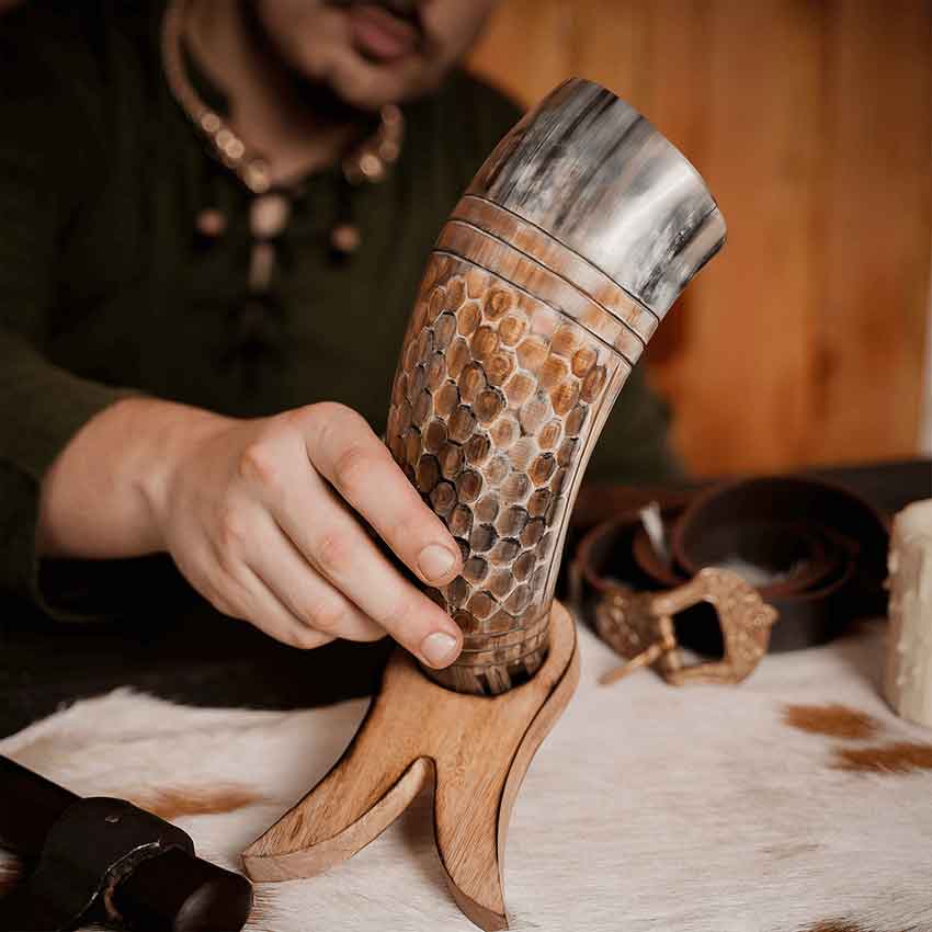The horn boasts a unique honeycomb engraving on the front. On the back, a linear pattern adds a touch of intricate detail. The result is not just a drinking vessel, but a work of art that stands as a testament to Viking craftsmanship. But this horn is not just about aesthetics. Its functionality complements its beauty. The natural curvature of the horn provides a comfortable and smooth drinking experience.