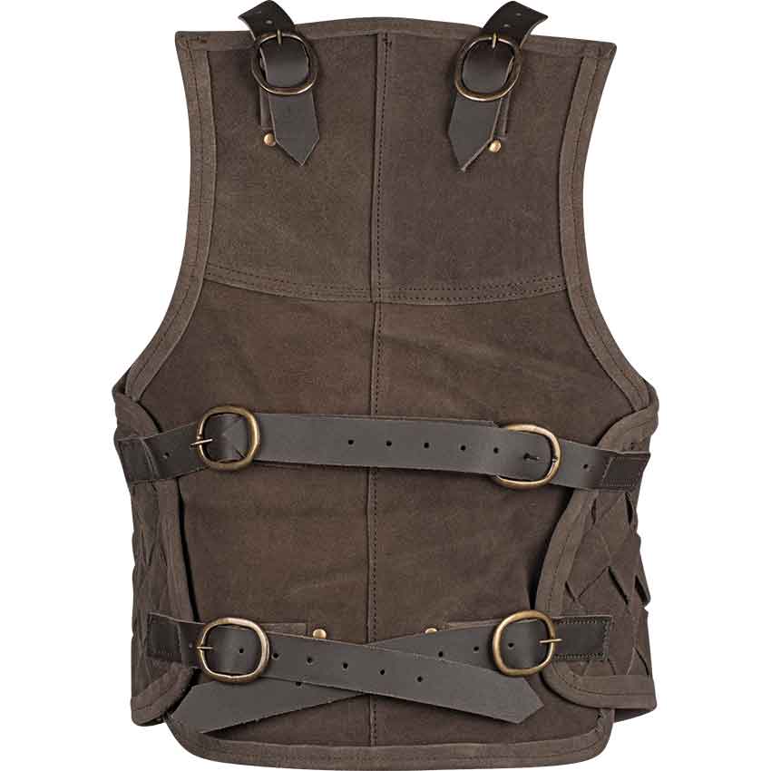 Warriors and fantasy adventurers know the value of wearing armour when heading out on a grand journey. Wear the Brown Viking Leather Armour. Made from woven strips of 7/8 ounce leather, this brown armour has a rough look suitable for barbarian and Viking characters. It comes in four sizes. The armour has a front and back plate. They secure together and onto the body with adjustable straps at the shoulders and the sides. Rivets secure the straps to the armor. The armour is sleeveless with rounded arm openings for better mobility. It works well for a variety of events, including reenactments, LARP events, and more.