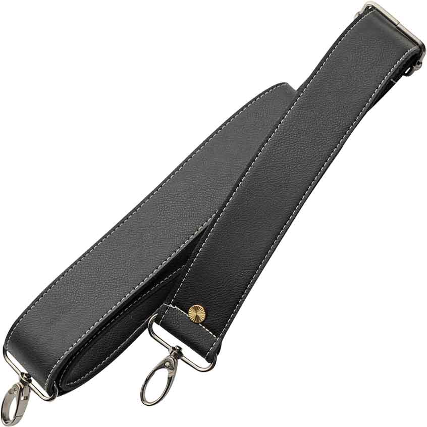 This Viking broadsword comes with a brown leather-wrapped scabbard. The throat is stitched with black leather for added detail and securing the guard when sheathed. The scabbard’s body has black leather bands with steel suspension rings. The steel chape at the bottom ensures the tip doesn’t poke through. You can wear the scabbard across your back thanks to black leather straps. These straps have lobster clasps that hook around the steel suspension rings. This buckled black strap can also be adjusted for the perfect fit.