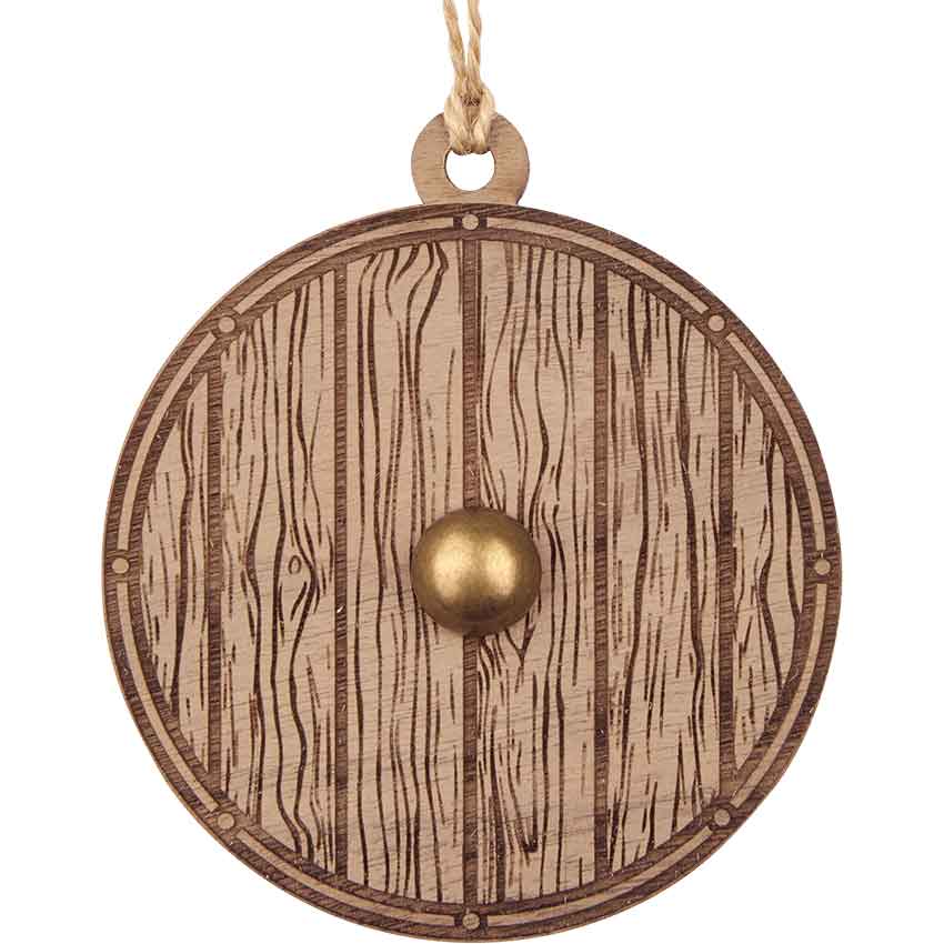 Add some Viking warrior style to your home or office decor by hanging up the Viking Shield Wooden Christmas Ornament for the holiday season. Made from solid walnut, this ornament comes as a single ornament. The ornament has a circular shape with a hole at the top. The hole has an attached rustic twine string for hanging. On the ornament, there is an engraved design on one side. The design makes the ornament look like a round Viking shield. It features an engraved wood grain as well as a faux rim. A brass-colored boss at the center of the shield finishes off the look. This wooden Viking ornament looks great hanging on a Christmas tree as well as with other holiday decorations.