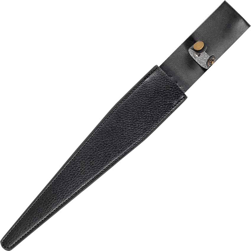 Then, the decorative dagger ends with a rounded pommel. It has a groove in the center. Raised detailing covers the pommel. Finally, this Norse fantasy dagger comes with a black leather sheath. The sheath has a loop on the top for hanging from a buckle belt or ring belt. Elevate your Norse god cosplay or add to your Norse weapon collection with this pop-culture inspired Viking dagger.