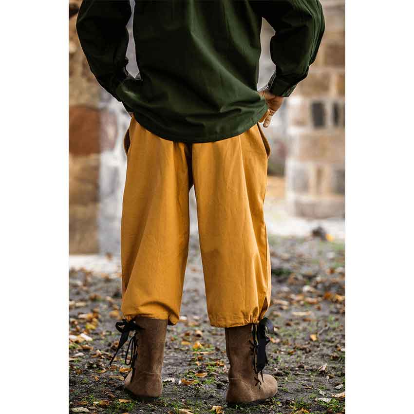 Crafted from pure cotton, these breeches are the perfect addition to your medieval outfit for adventures. They’re colored honey brown for a vibrant, yet natural look. These medieval pants are loose fitting at the thigh and gather into a closer fit right at the fabric tie cuffs. They end above the ankles and can be gathered just under the knee for a historical breeches look. They’re modeled after authentic medieval styles. These breeches come in multiple sizes.