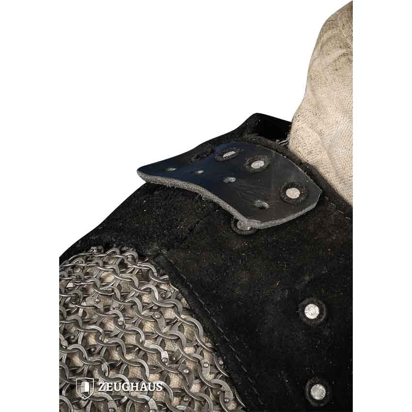 At the heart of the Visby Brigandine are the large internal mild steel plates, blackened and strategically overlapped to ensure maximum coverage and protection. This foundational strength is concealed beneath a luxurious black leather exterior, where each plate is securely riveted, presenting a blend of durability and design. The rounded crenelated hem not only adds a distinctive silhouette but also enhances mobility, allowing for greater freedom of movement without compromising on defense.
