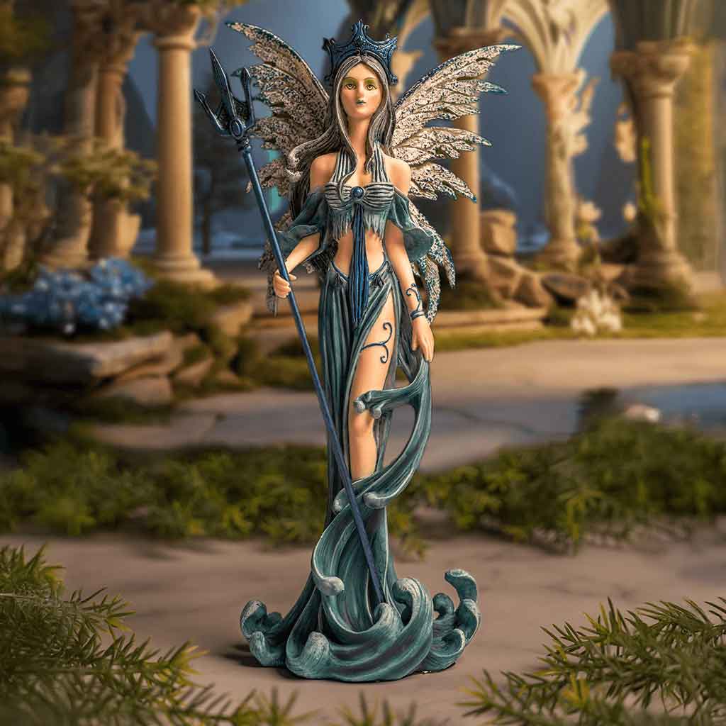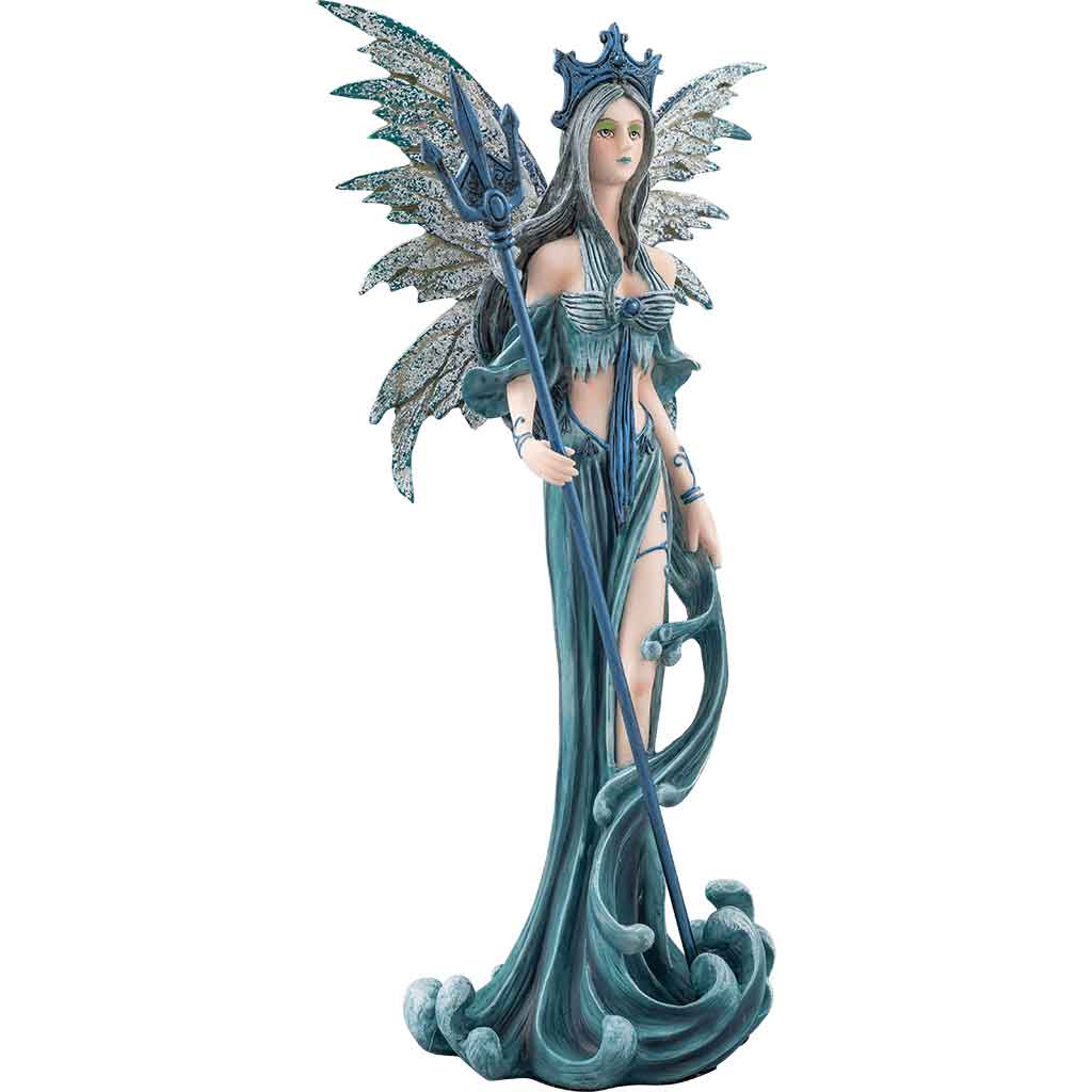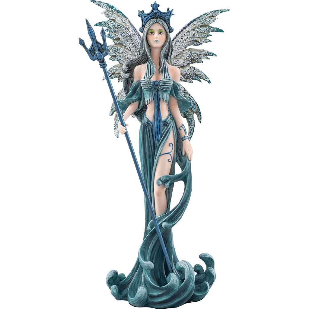 The Water Fairy Statue symbolizes the water sign. This fairy statue features a fairy rising from the sea. She stands beautifully with a trident in her hand. This fairy statue is made of hand painted cold cast resin and measures 10 inches tall. The Water Fairy Statue is stunning and would make a great piece to display anywhere in your home.