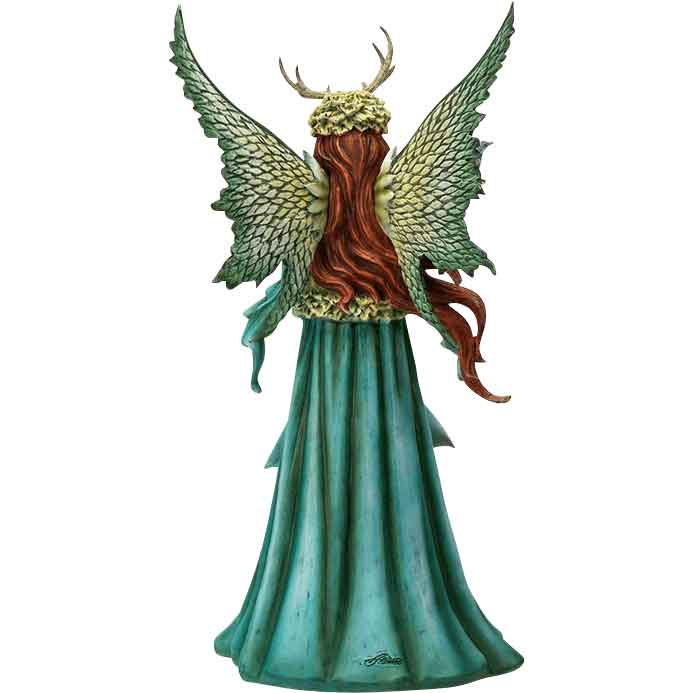 The statue’s vibrant hues of lush green echo the thriving forest, while the stunning details of her bright green wings create a striking visual that seems to flutter in a gentle breeze. An intricate vine pattern running up the center of her dress tells a tale of growth and renewal, inviting you to connect with the natural world around you.