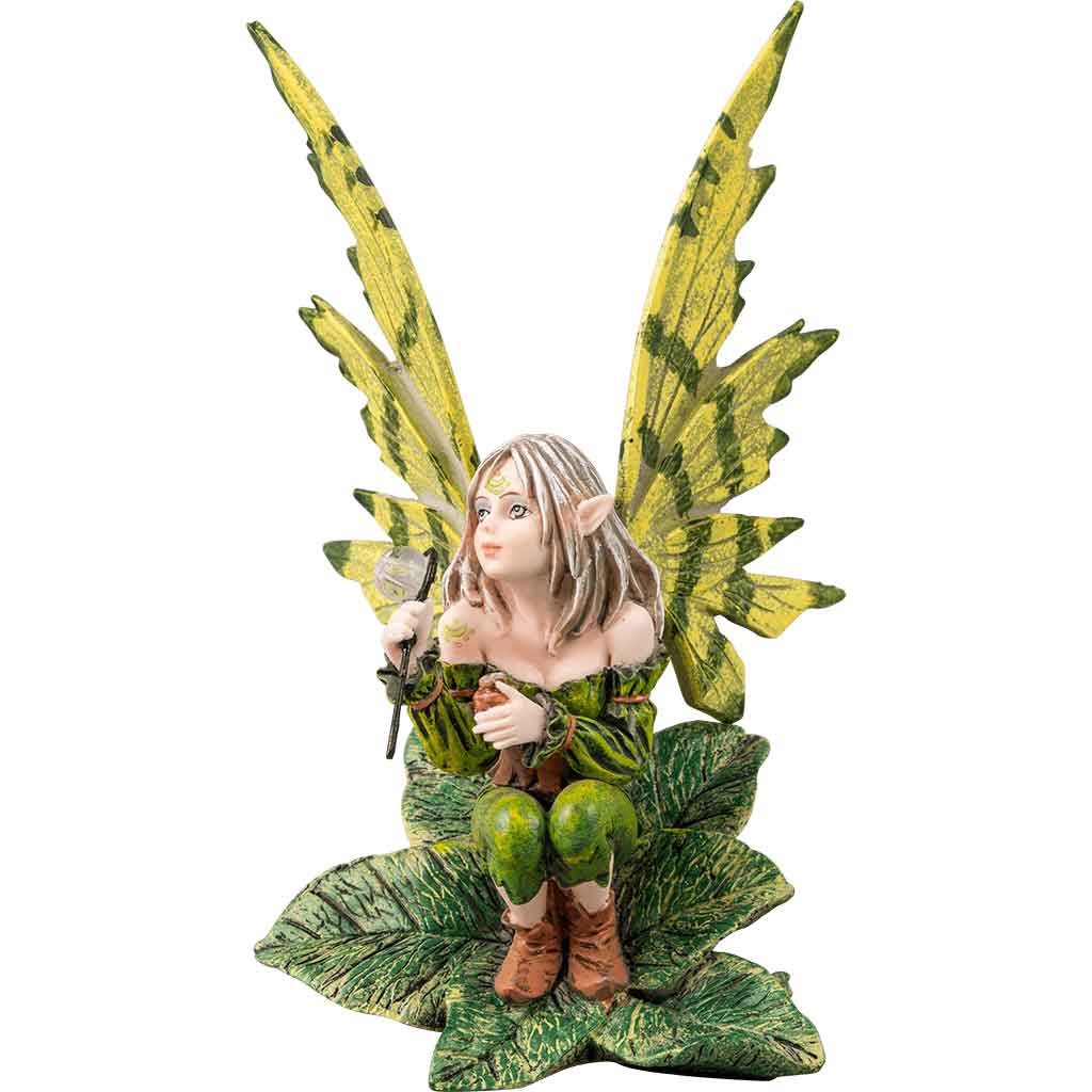 The Woodland Bubble Fairy Statue features a tiny fairy dressed in green sitting inside a leafy fern. Her two-toned green wings are outstretched behind her as she blows bubbles. This fairy statue is made of hand painted cold cast resin and measures 6.25 inches tall. The Woodland Bubble Fairy Statue is stunning and would make a great piece to display anywhere in your home.