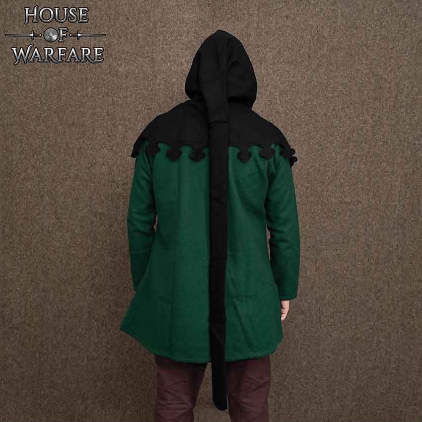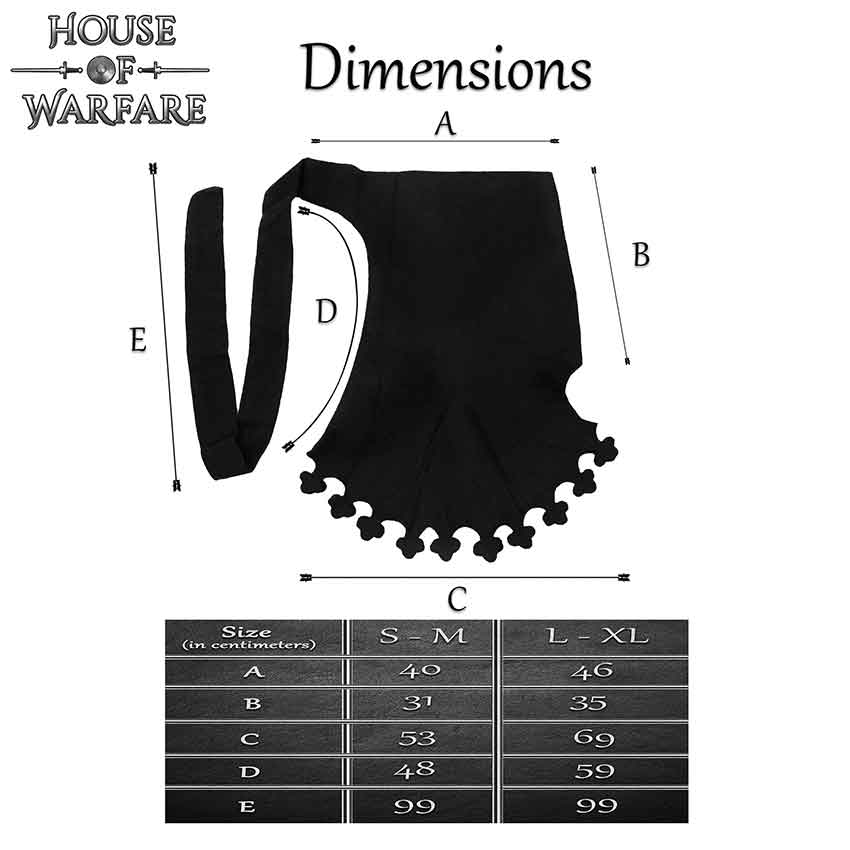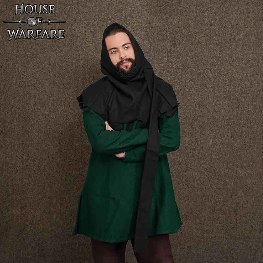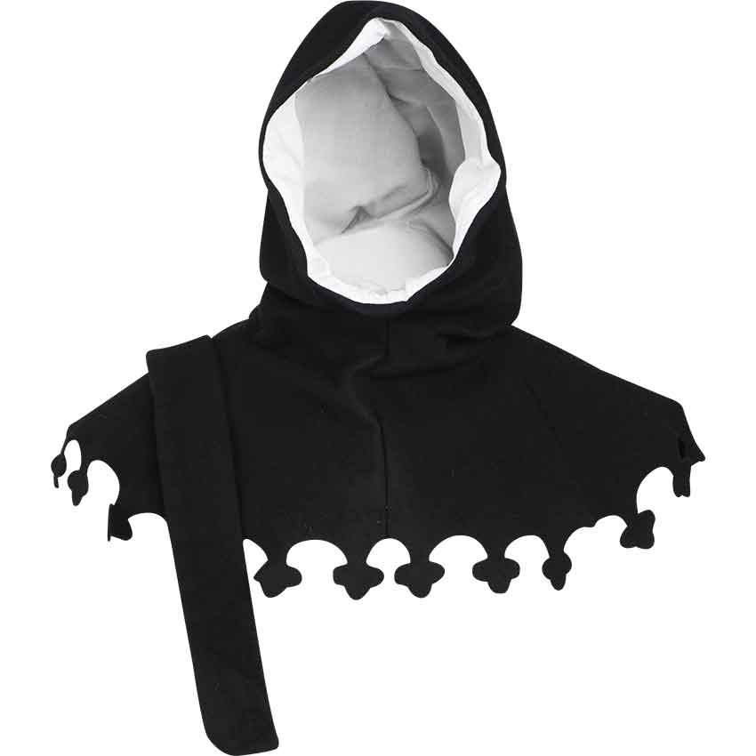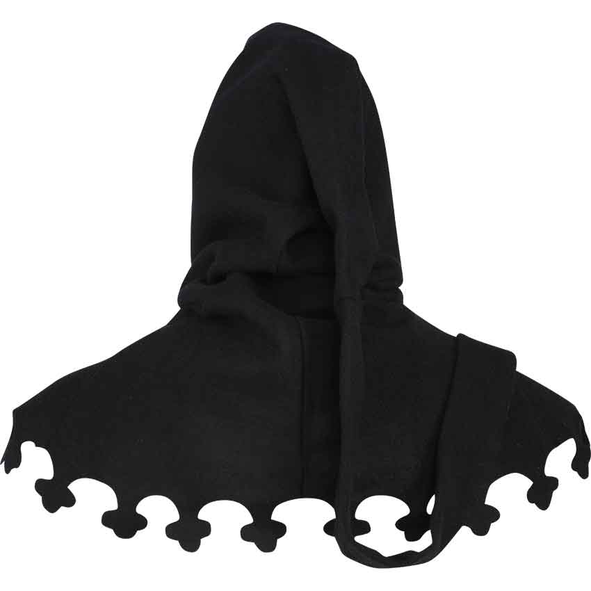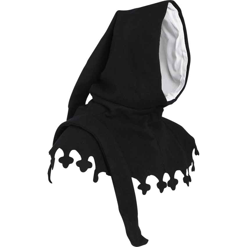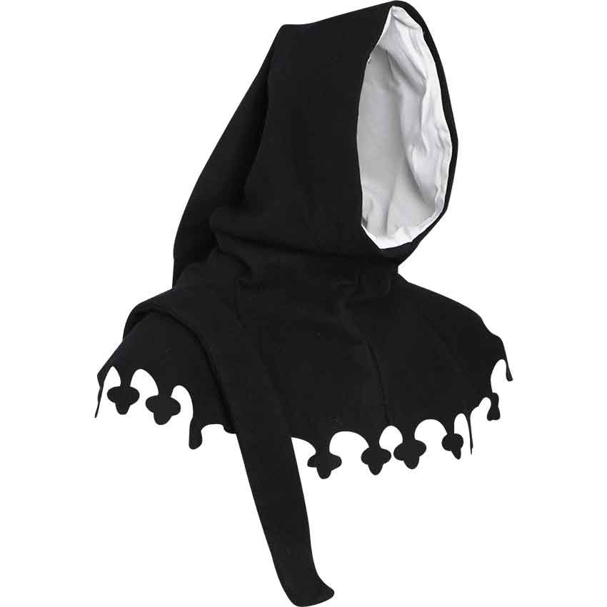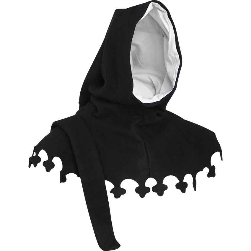 Many medieval and fantasy costumes do not look complete without some sort of headwear. Add the Black Wool Medieval Liripipe Hood to your ensemble. This black woolen hood comes in two sizes. It has a liripipe style hood. A liripipe style hood has a long tail at the back. The hood has an attached mantle that covers the shoulders. Along the bottom hem of the mantle is a trefoil style pattern. The inside has a white cotton lining giving it increased comfort. In addition, the wool material adds warmth, making the hood perfect for events in cooler weather. Wear the Black Wool Medieval Liripipe Hood to your next reenactment, Renaissance festival, or LARP event.